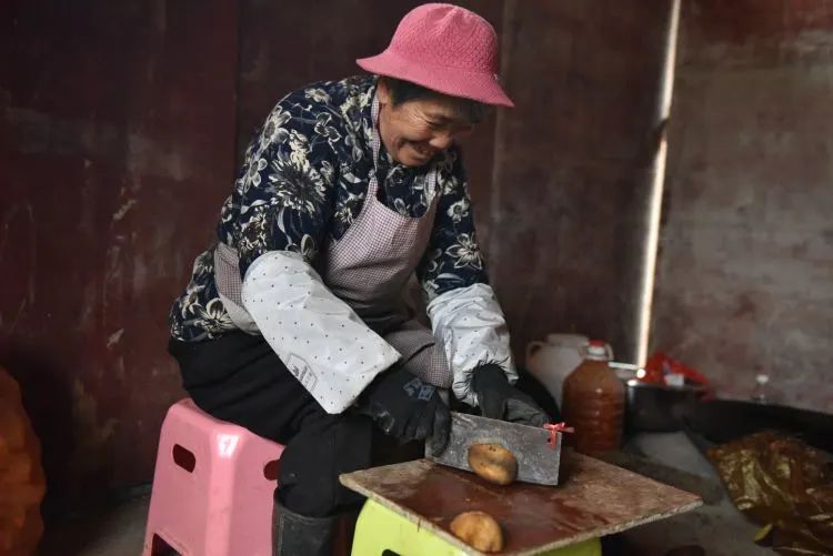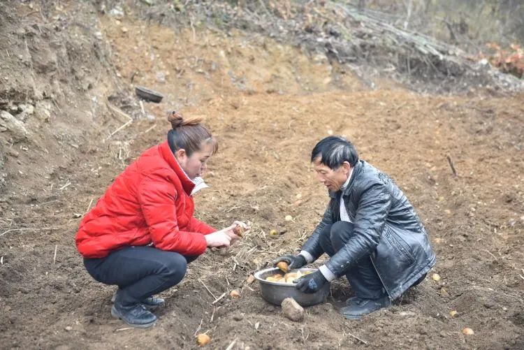 在谷龙社区的田间地头,土豆种植户们已经忙活起来,在半山腰的小木屋内,村民把土豆种薯切成块,保留了薯芽的部分,然后装到背篓中,再背到地间。村民们在地间来回穿梭,分工有序,犁地、打窝、点种、施肥、覆土,现场好不热闹。