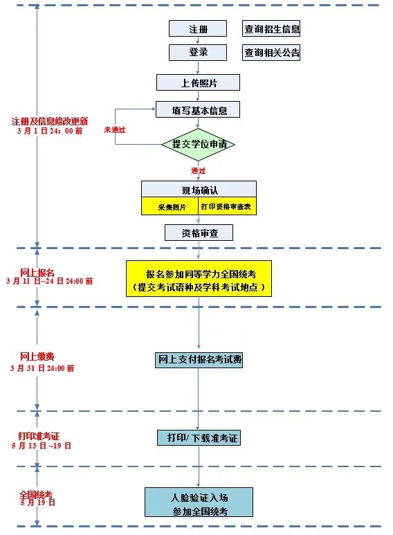 (一)注册及在册信息修改。拟参加2024年同等学力全国统考的考生,需于3月1日24:00前在信息平台完成注册、信息采集(电子照片等)及在册信息更新,逾期不可重新注册及修改。2024年同等学力全国统考报名流程见附件。温馨提示:手机短信为考生接收报名相关信息的重要途径,请务必填写能够准确联系到考生本人的手机号码。