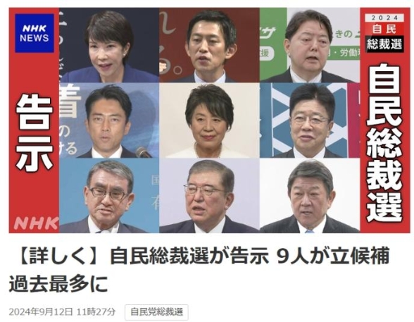 报道称,这是自民党总裁选举自1972年引入推荐人制度以来,候选人最多的一次选举。名单公布后,9位候选人将在自民党总部分别发表演讲,正式开始选举辩论。