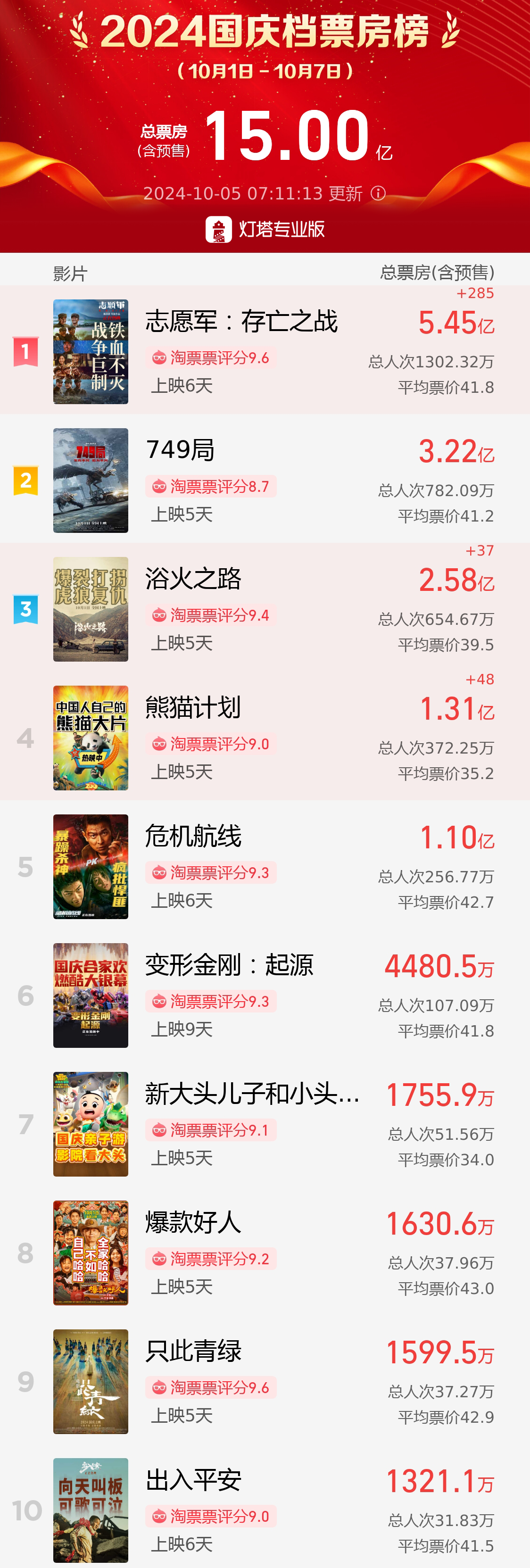 据网络平台数据,截至10月5日7时11分,2024年国庆档(10月1日—10月7日)档期内总票房(含预售)突破15亿。