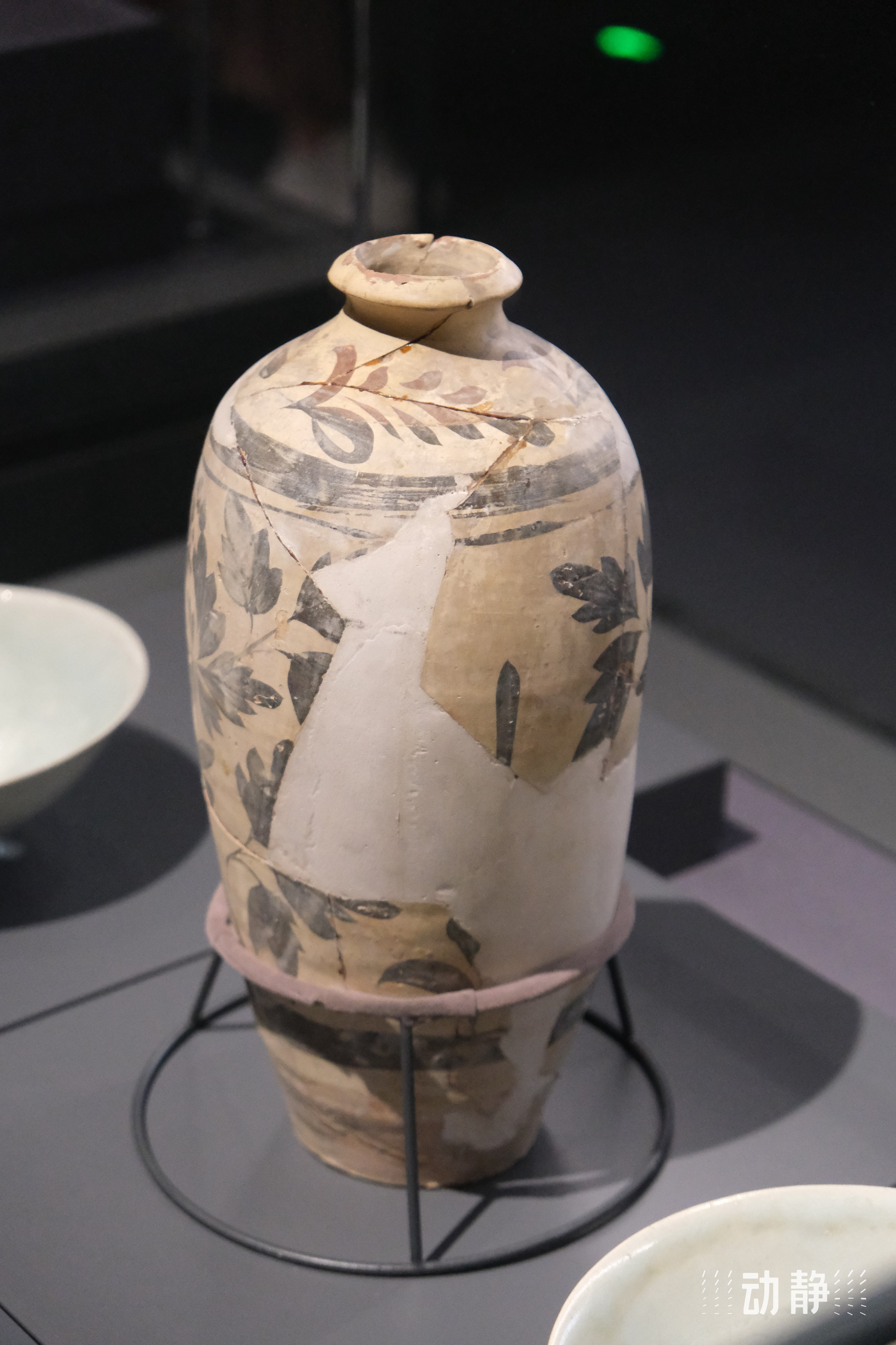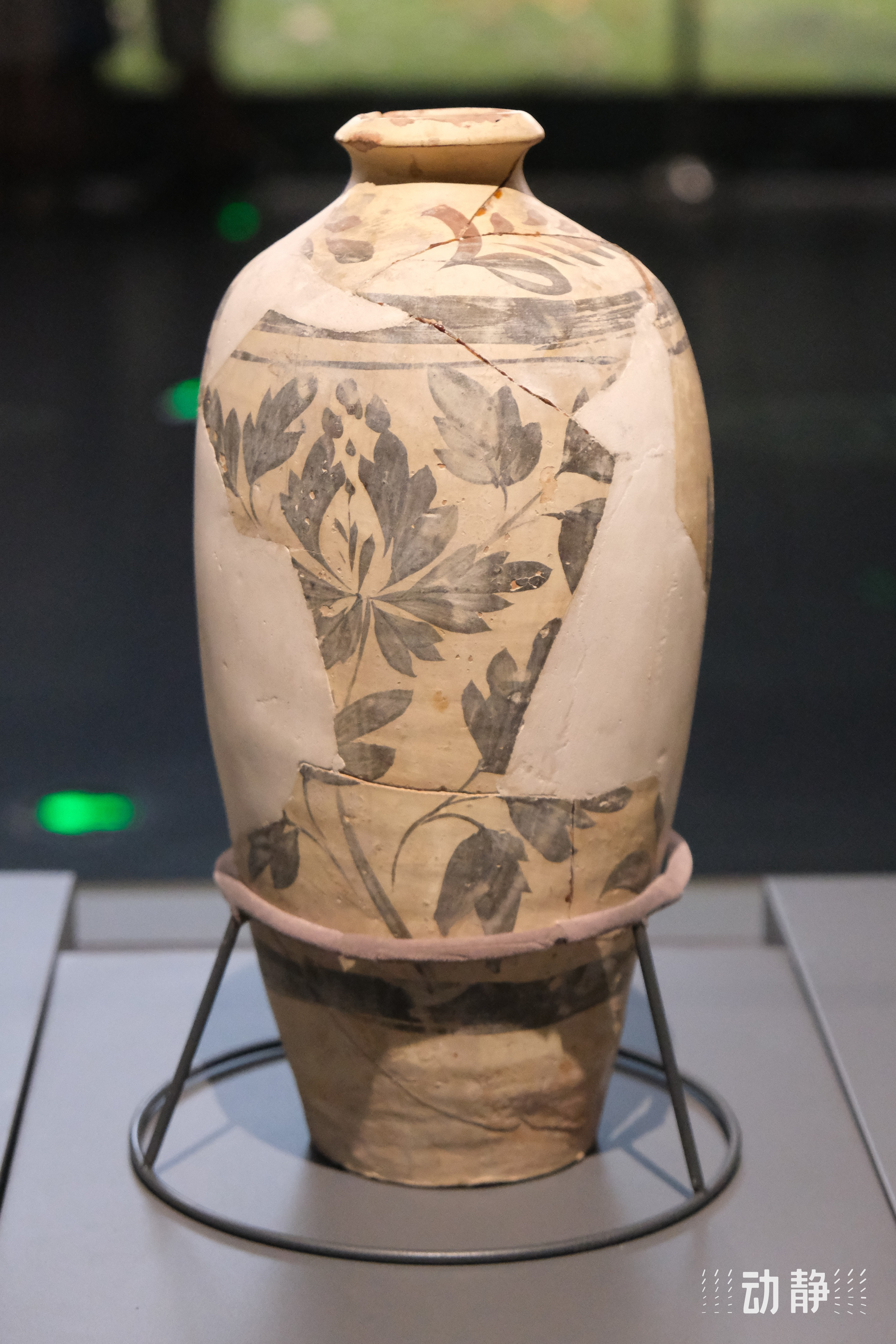 图中的白地黑花牡丹纹梅瓶,为小口翻沿尖唇、短束颈、口上有一棱、长腹、丰肩、平底。腹部彩绘缠枝黑色牡丹花,在肩部和腹下各饰一道弦纹,肩的上部绘有草叶纹三枝,属磁州窑系,亦是贵州对外交通繁荣的物证。