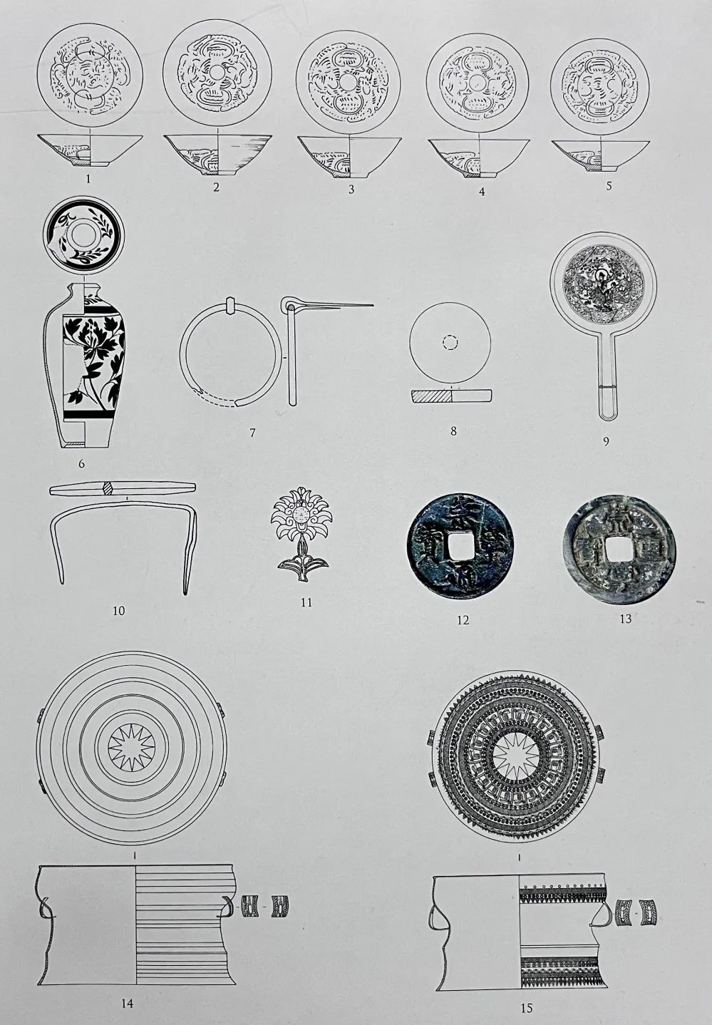 杨粲墓早年被盗,除二面铜鼓、一面铜镜、四件影青瓷碗和二方镇墓石较为完整外,其它器物皆残缺破碎。
