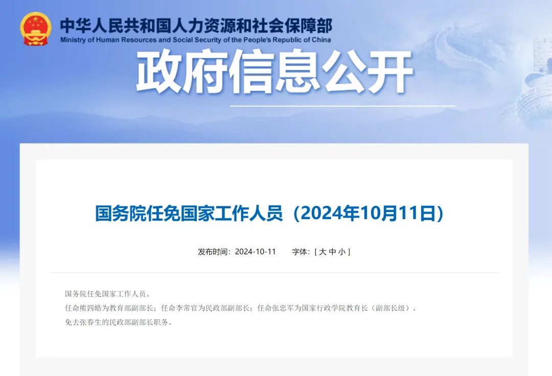 任命熊四皓为教育部副部长;任命李常官为民政部副部长;任命张忠军为国家行政学院教育长(副部长级)。