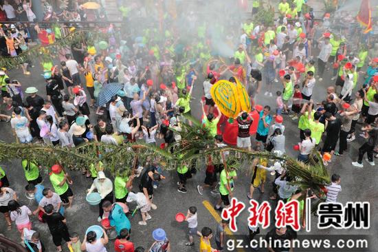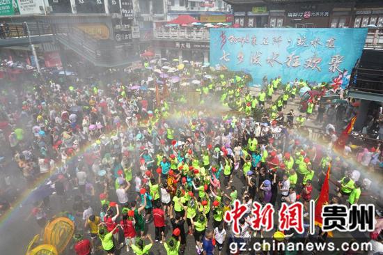 中午1时18分,“来石阡·玩水龙”七夕泼水狂欢聚活动正式开始,起龙开光仪式结束后,9条水龙沿着县城老街巡游,巡游现场,锣鼓喧天,市民和游客们纷纷拿着水枪、水管、水瓢等工具向水龙泼水,现场热闹非凡。