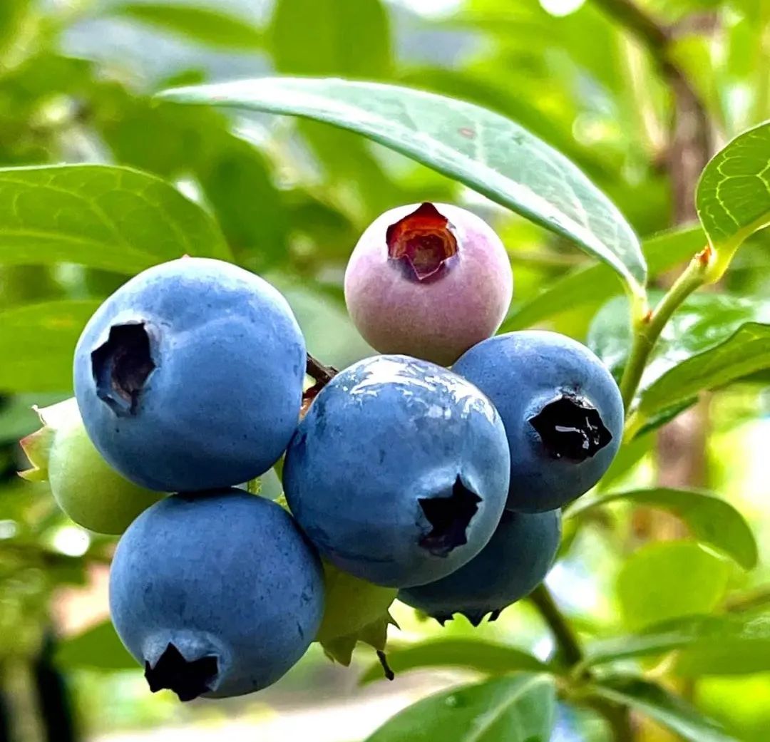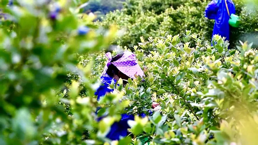 在蓝莓基地里,一株株蓝莓树上挂满了沉甸甸的果实,工人们正忙于采摘,满眼青翠的果园迎来初夏的丰收季。