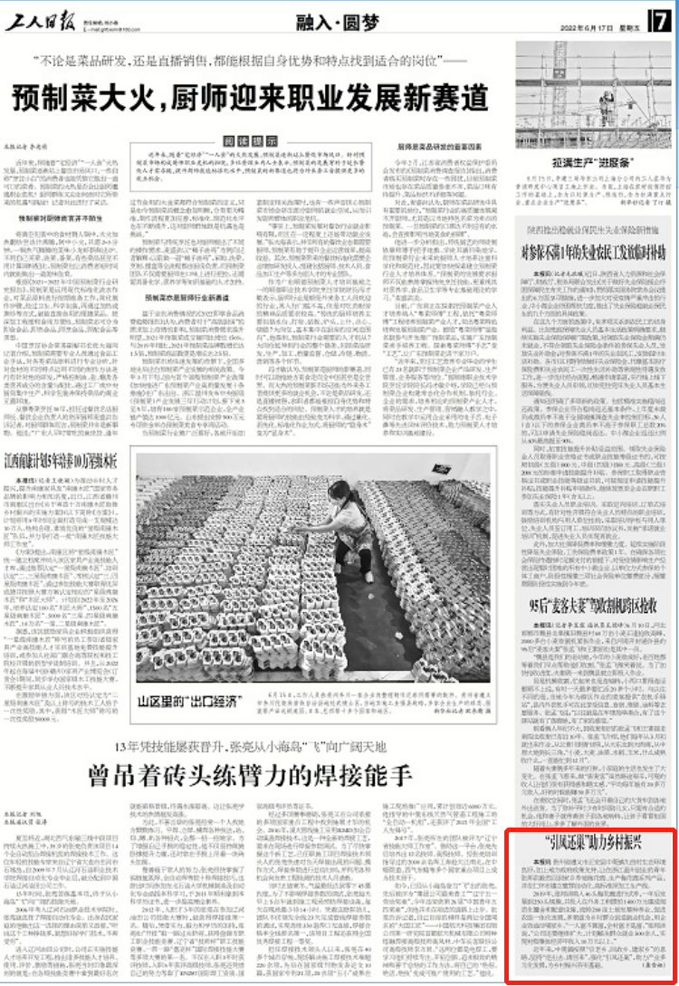 今天(6月17日),《工人日报》刊发新闻《“引凤还巢”助力乡村振兴》。