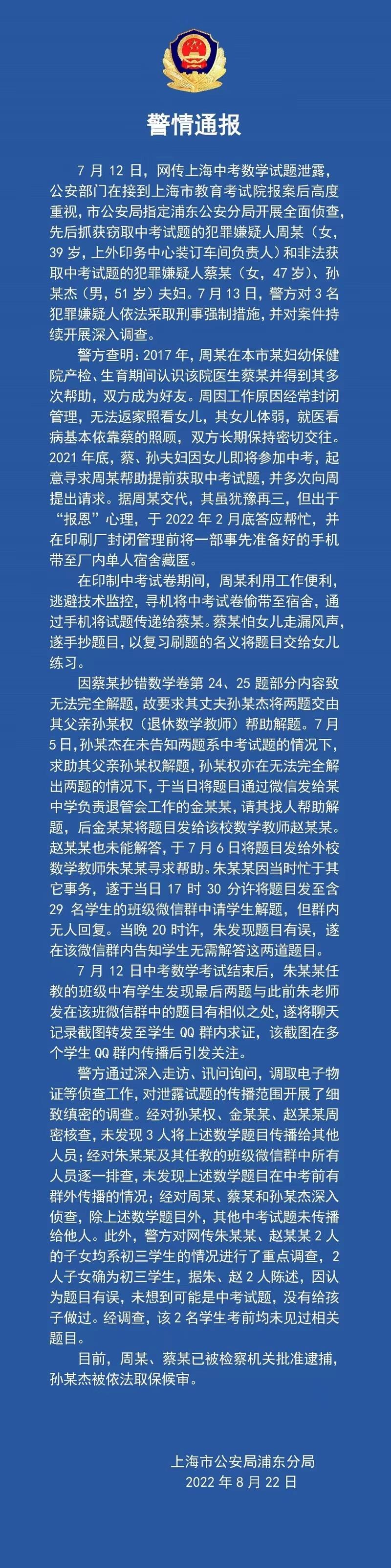 8月22日,上海市公安局浦东分局发布警情通报称,已对窃取中考试题的犯罪嫌疑人周某和非法获取中考试题的犯罪嫌疑人蔡某、孙某杰夫妇依法采取刑事强制措施。具体通报如下: