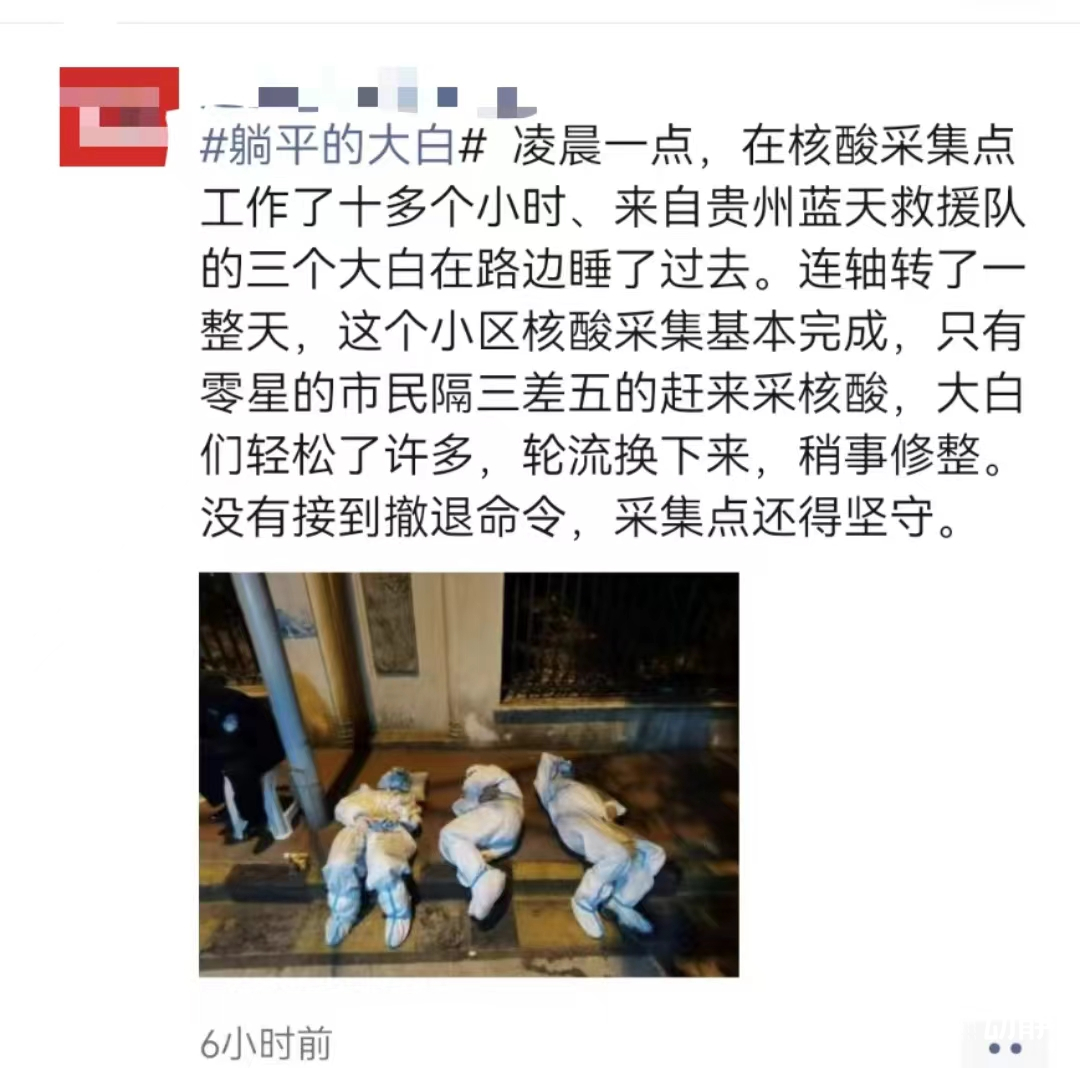 9月3日,贵阳市部分辖区启动了区域全员核酸筛查工作,云岩区、南明区、观山湖区全域,乌当区、白云区、清镇市部分地区都需要完成全员核酸筛查“三天两检”。为了连夜做完筛查,核酸采样点的“大白”日夜兼程、不惧风雨。