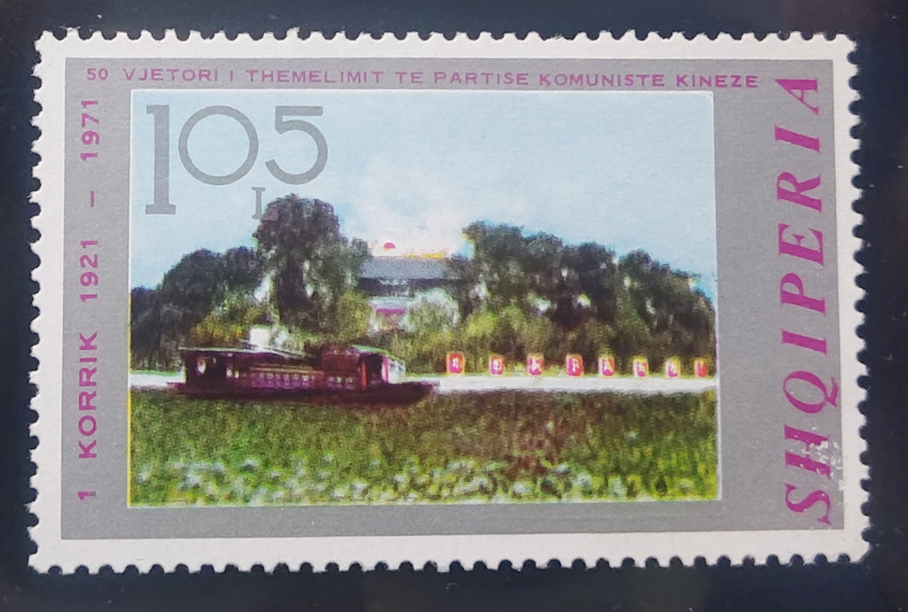 1971年7月1日,阿尔巴尼亚为庆祝中国共产党成立50周年发行纪念邮票。邮票上有南湖烟雨楼、南湖红船以及绿草湖面等场景。、