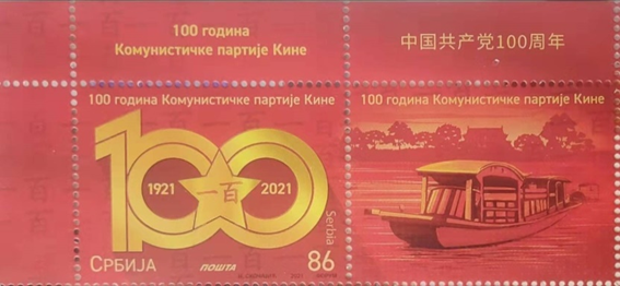 2021年11月29日,塞尔维亚共和国为庆祝中国共产党成立100周年,发行特种纪念邮票,全套6张,上面除印有“中国共产党100周年”“一百”等字样外,还分别以长城、天安门城楼、上海浦东新区、红船等为主要图案。