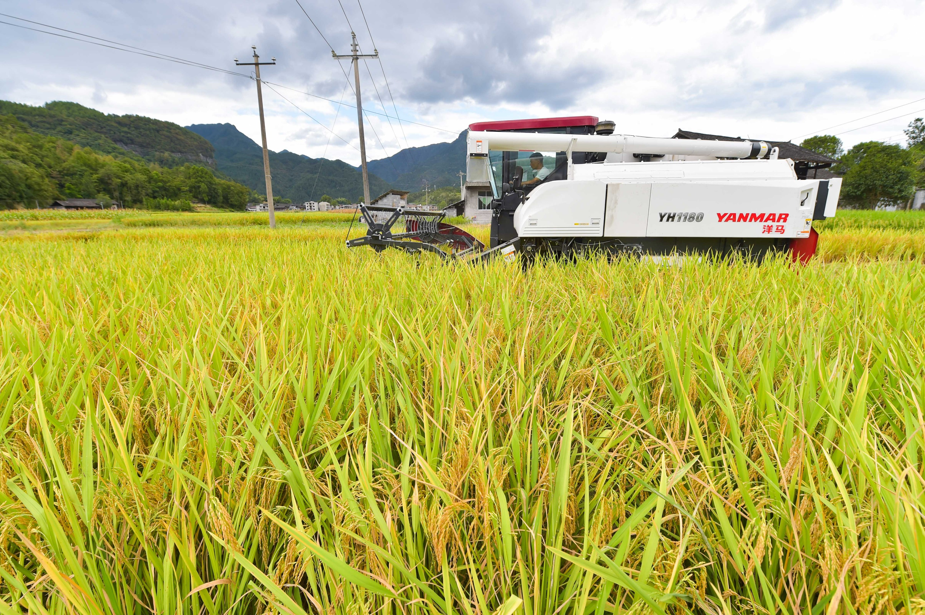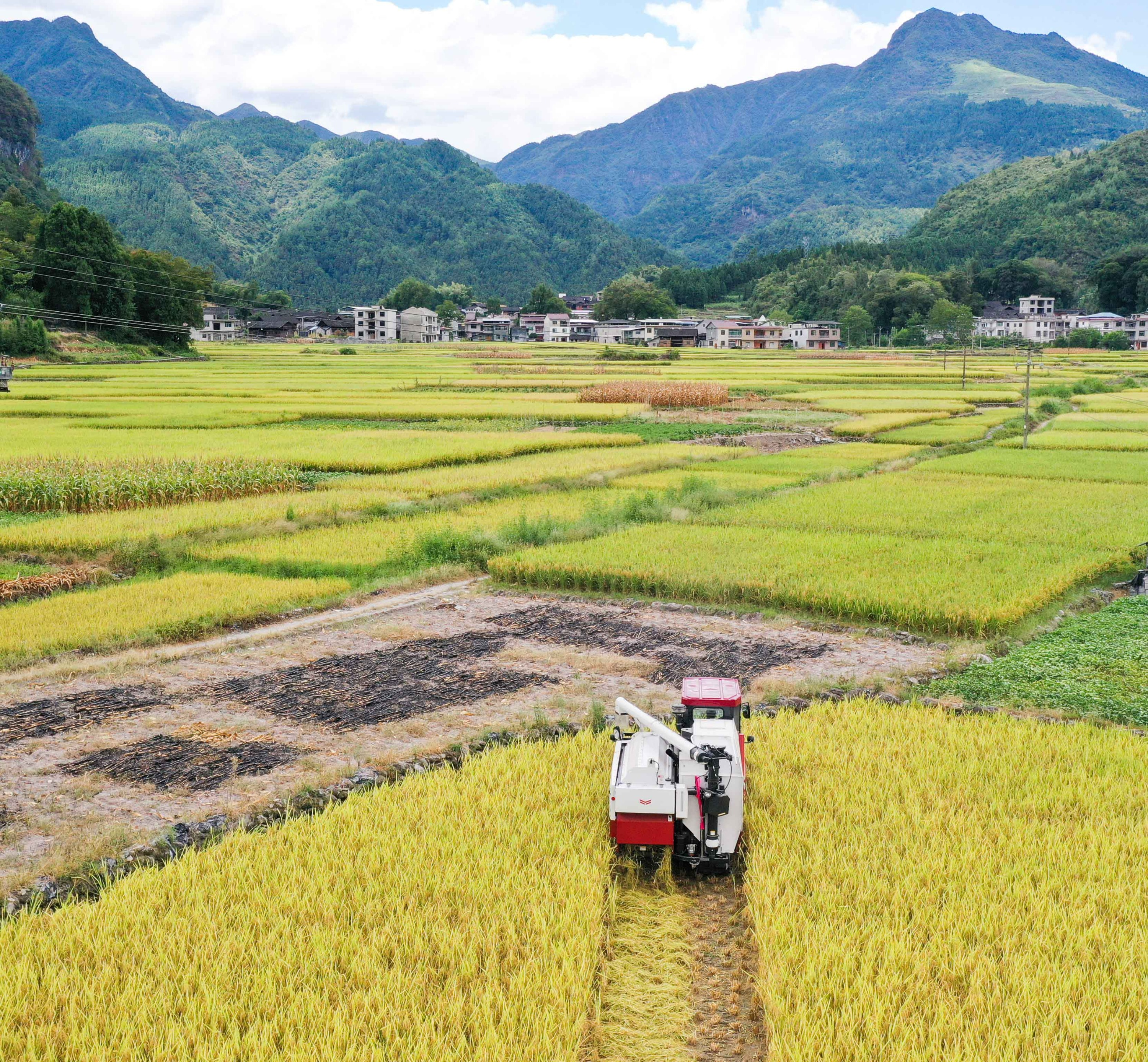 田间传来一阵阵轰隆隆的声响,收割机开足马力来回穿梭在稻田里。收割机所到之处,不仅把稻谷收割好,同时把秸秆粉碎在田里。20分钟不到,一亩地便采收好了。