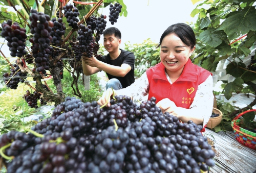 近日,党员志愿者在贵州赤水市长沙镇长兴村葡萄园里帮助农户采摘葡萄。近年来,长沙镇引导农民采取“党支部+合作社+农户”模式种植葡萄、西瓜等,打造农旅融合田园观光综合体,带动农民增收,助力乡村振兴。