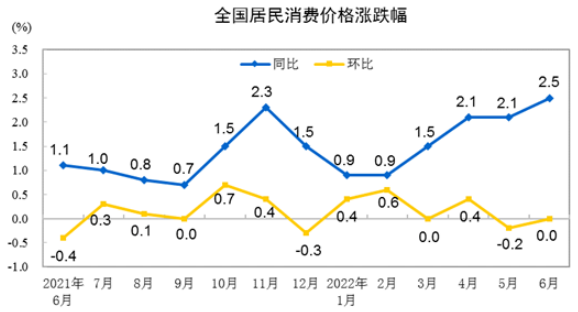 ▲6月份,全国居民消费价格同比上涨2.5%。其中,城市上涨2.5%,农村上涨2.6%;食品价格上涨2.9%,非食品价格上涨2.5%;消费品价格上涨3.5%,服务价格上涨1.0%。1—6月平均,全国居民消费价格比上年同期上涨1.7%。
