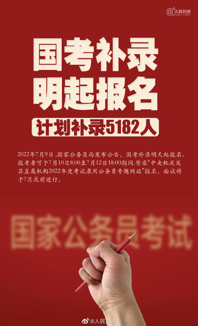 ▲国家公务员局发布公告,国考补录今天起报名。报考者可于7月10日8:00至7月12日18:00期间登录“中央机关及其直属机构2022年度考试录用公务员专题网站”→网页链接 进行网上报名,面试将于7月底前进行。
