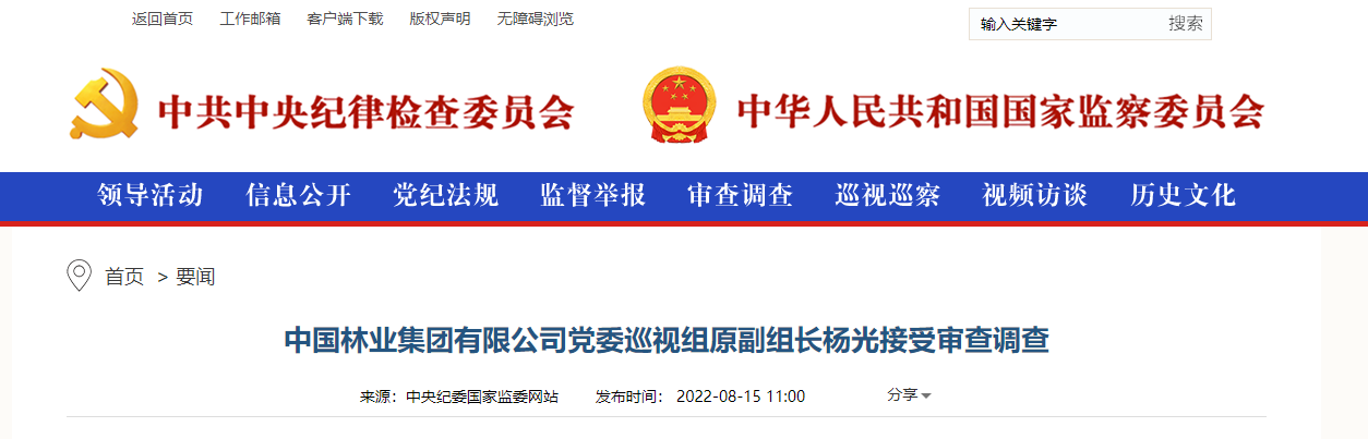 据中央纪委国家监委驻国资委纪检监察组、辽宁省纪委监委消息:中国林业集团有限公司党委巡视组原副组长杨光涉嫌严重违纪违法,目前正接受中央纪委国家监委驻国资委纪检监察组纪律审查和辽宁省沈阳市监委监察调查。