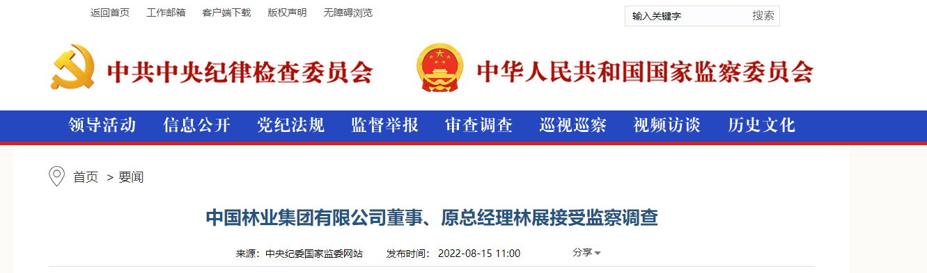 据中央纪委国家监委驻国资委纪检监察组、辽宁省纪委监委消息:中国林业集团有限公司董事、原总经理林展涉嫌严重违法,目前正接受辽宁省沈阳市监委监察调查。
