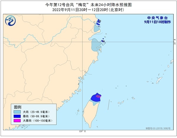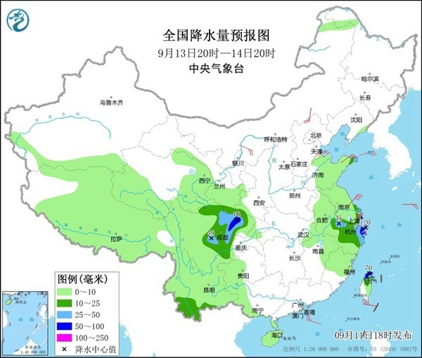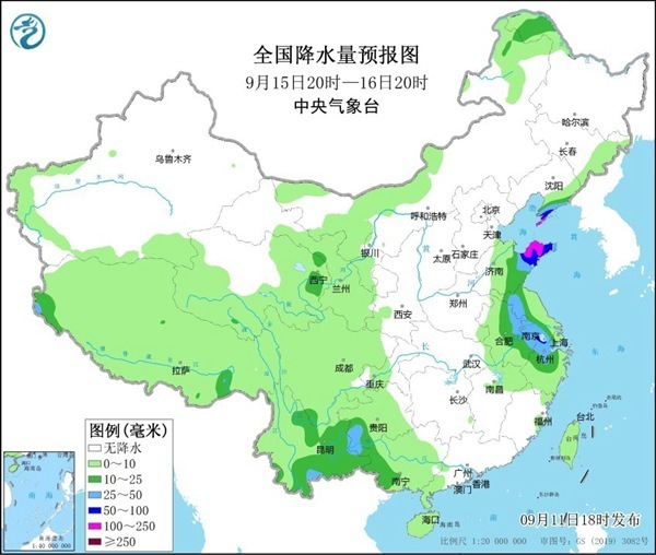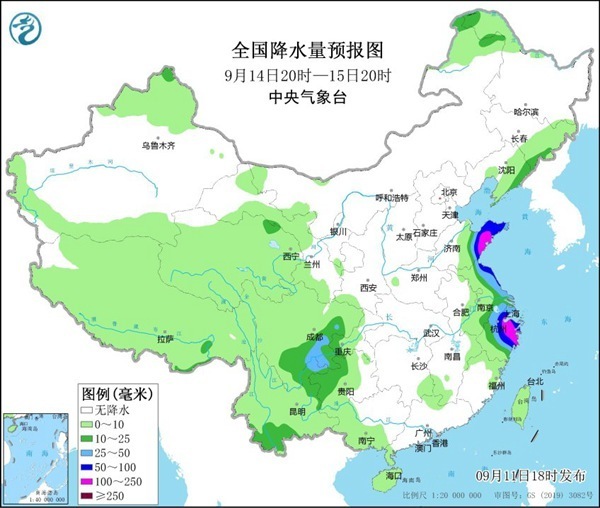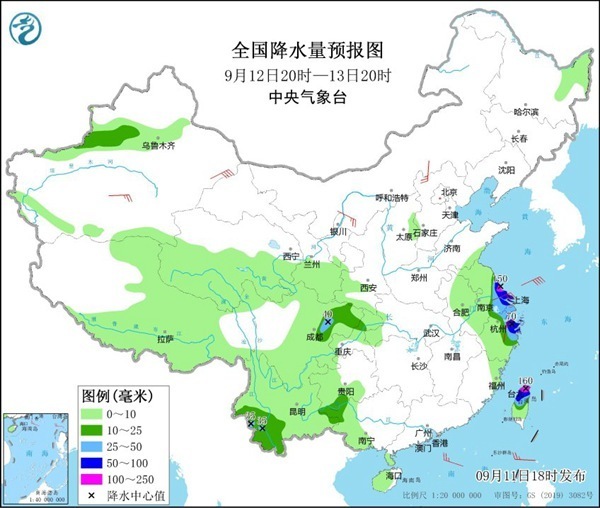 降水预报:9月11日20时至12日20时,江苏东南部、上海北部、浙江东部沿海、台湾岛北部等地有中到大雨,其中部分地区有暴雨或大暴雨(100-150毫米)。