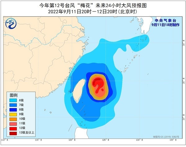 大风预报:9月11日20时至12日20时,东海中部和南部海面、台湾海峡、台湾以东洋面、巴士海峡、台湾省沿海、钓鱼岛附近海域有6-7级大风,阵风8-9级;东海东南部海域和台湾以东的部分海域有8-11级大风,“梅花”中心经过的附近海面和地区的风力有12-16级,阵风可达17级。