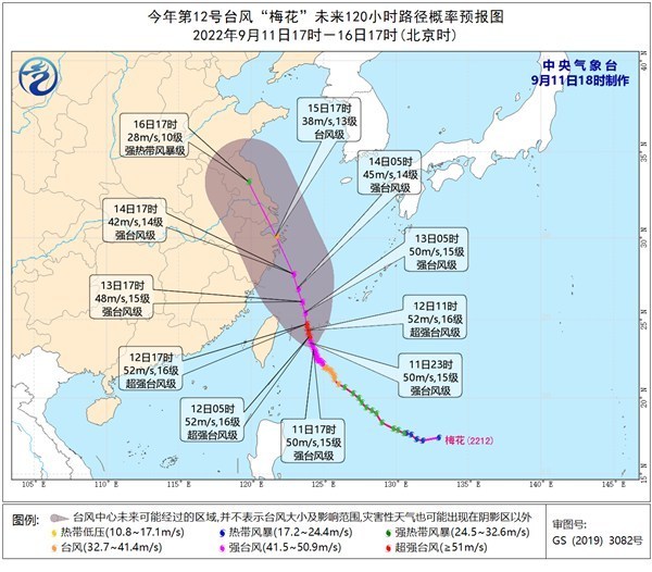 预计,“梅花”将以每小时5-10公里的速度向北偏西方向缓慢移动,强度变化不大或略有增强,最强可达50-55米/秒(15-16级,强台风级或超强台风级)。12日晚上强度开始缓慢减弱,并继续向北偏西方向移动,穿过琉球群岛后进入东海南部海面,逐渐向浙江东部沿海靠近,并可能于15日登陆或擦过上述沿海地区。