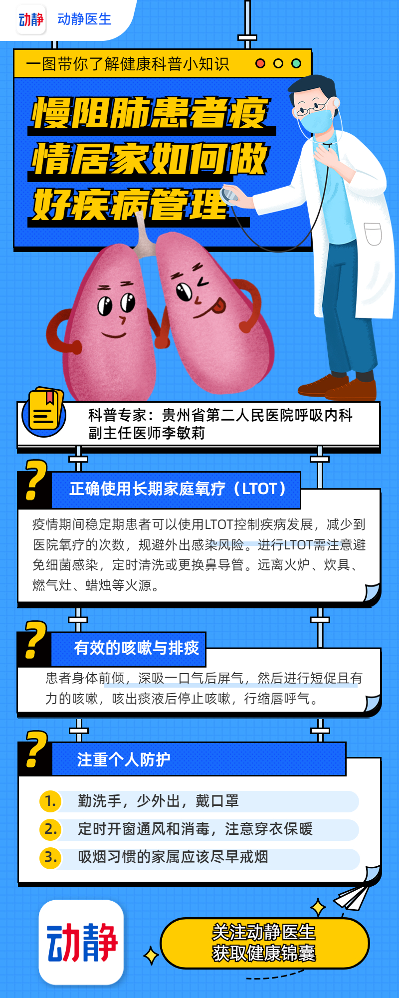 慢性阻塞性肺疾病(COPD),简称慢阻肺,是一种好发于中老年、免疫力低下人群的慢性气道疾病,主要表现为咳嗽、咳痰,喘息、胸闷等。疫情期间,静态居家的患者又该如何做好疾病管理与居家防护?下面这张图片中的提示非常重要↓↓↓