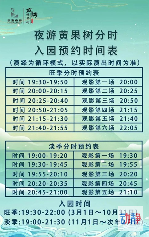 动静记者从贵州省黄果树智慧旅游股份有限公司了解到,从6月15日起,夜游黄果树景区将实行“分时段预约入园”,每批次限流300人,六个时段分批次预约。