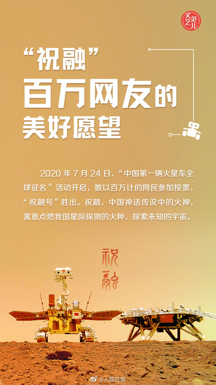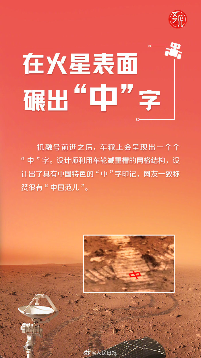 百万网友投票征名,“天圆地方”的传统美学,受蝴蝶启发的外形设计,在火星表面碾出的“中”字,桅杆顶端上的“火”字印章,国旗旁的冰墩墩、雪容融……“天问一号”的火星车祝融号,车身上充满了巧思的中国元素。细节满满,戳图来看↓↓