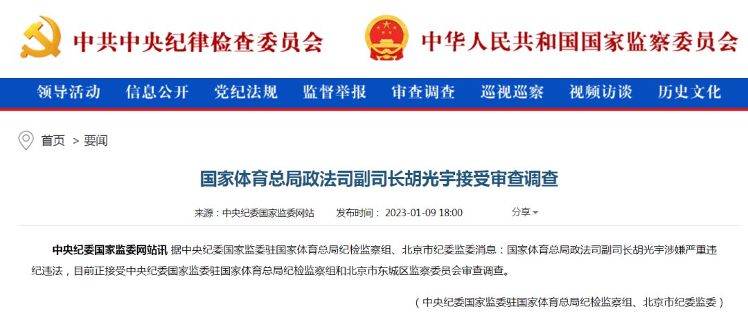 据中央纪委国家监委驻国家体育总局纪检监察组、北京市纪委监委消息:国家体育总局政法司副司长胡光宇涉嫌严重违纪违法,目前正接受中央纪委国家监委驻国家体育总局纪检监察组和北京市东城区监察委员会审查调查。