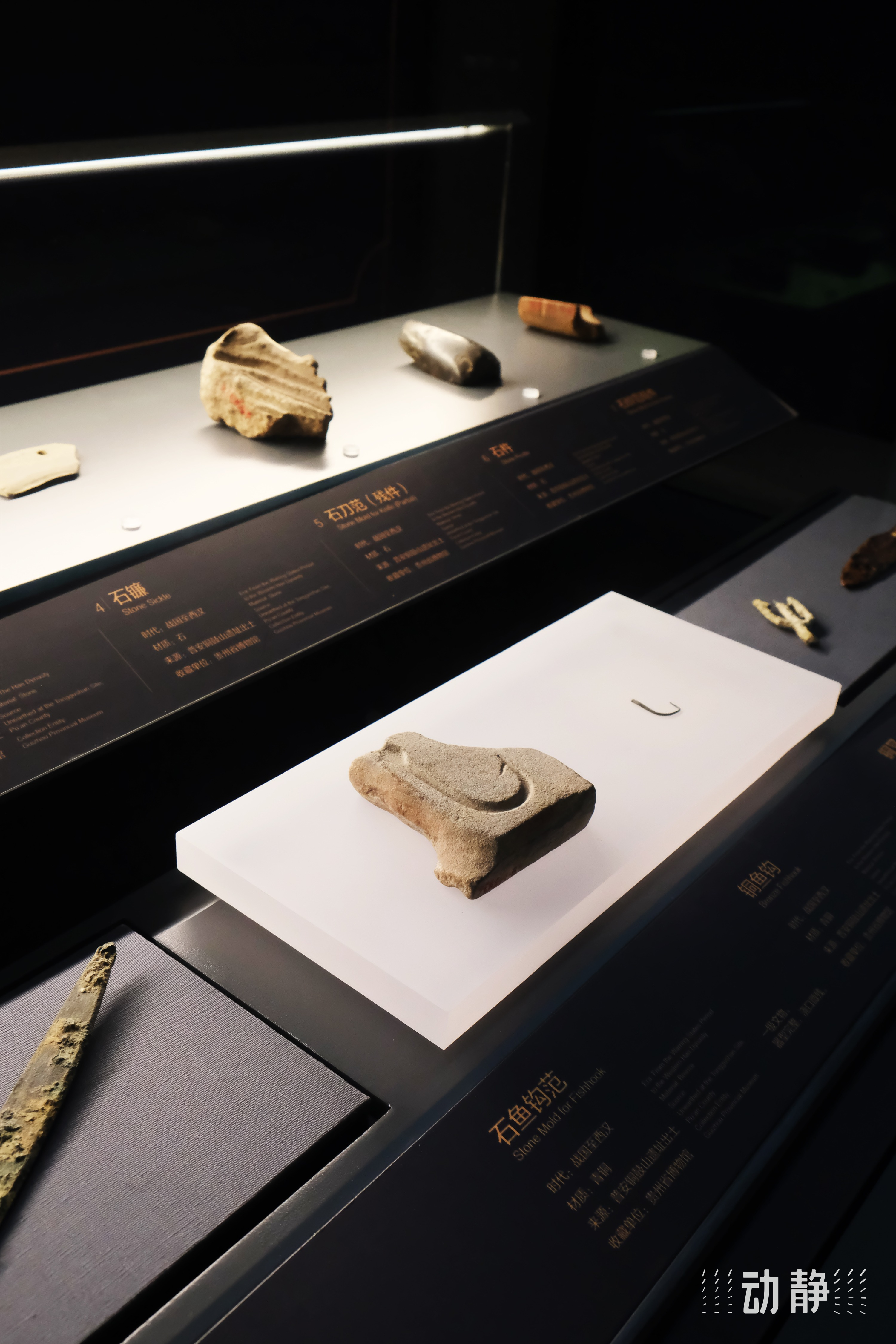 此外,在“郡国并治 多族共融——秦汉至魏晋南北朝”展区中,还有一个有趣的文物展出:石鱼钩范。1980年10月,在黔西南普安县青山镇铜鼓山遗址发掘出土,为一级文物,是制作鱼钩的模子。石范整体完整,浇口微残。