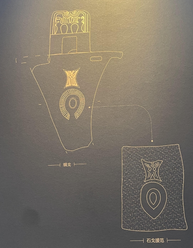图为石戈模残件,一级文物。戈内(NÀ)部石模残件,红砂岩。上刻三人牵手图案。类似风格的铜戈广见于西南地区,但相关模范仅见于普安铜鼓山遗址。