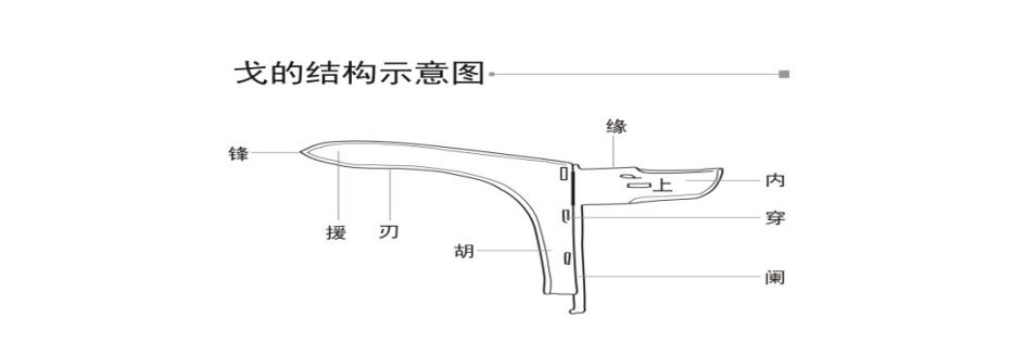 “援”是戈的长条形锋刃部分,上下有刃,前端尖锐,可以啄击敌人,下刃可以割伤敌人,是戈的主要杀伤部位。“内”位于援的后尾,呈棒状,用来安装木柄,多像方形的榫头,是插入戈柲的部分。“胡”是指从援的下部延至内末的弧曲下垂部分,上面一般穿有1至3个圆孔,用来绑缚戈头于木柄上,保证实战时戈头不易脱落。同时,从力学角度看,“胡”还能缓冲“援”的受力,确保“援”在砍刺时不易损坏。