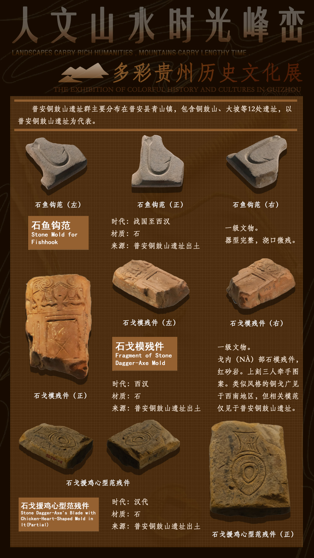 普安铜鼓山遗址出土数十件铸造青铜兵器及小型工具的石范和陶模,如戈、剑、钺、铃、鱼钩等,说明这里曾是夜郎地区一个重要青铜器铸造场所。石范和陶模直观地反映出当时青铜加工的工艺技术,同时也蕴含了许多重要文化信息。