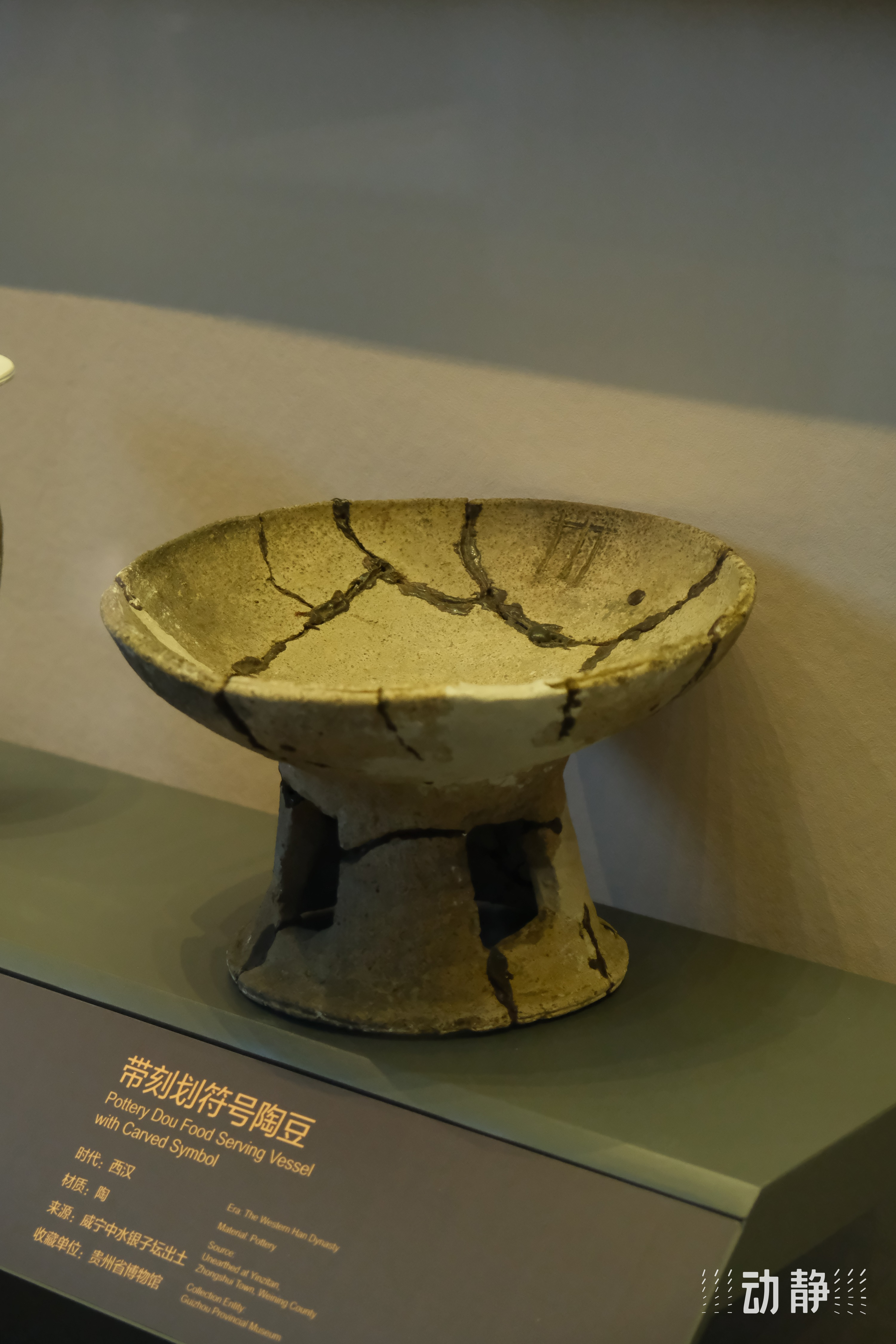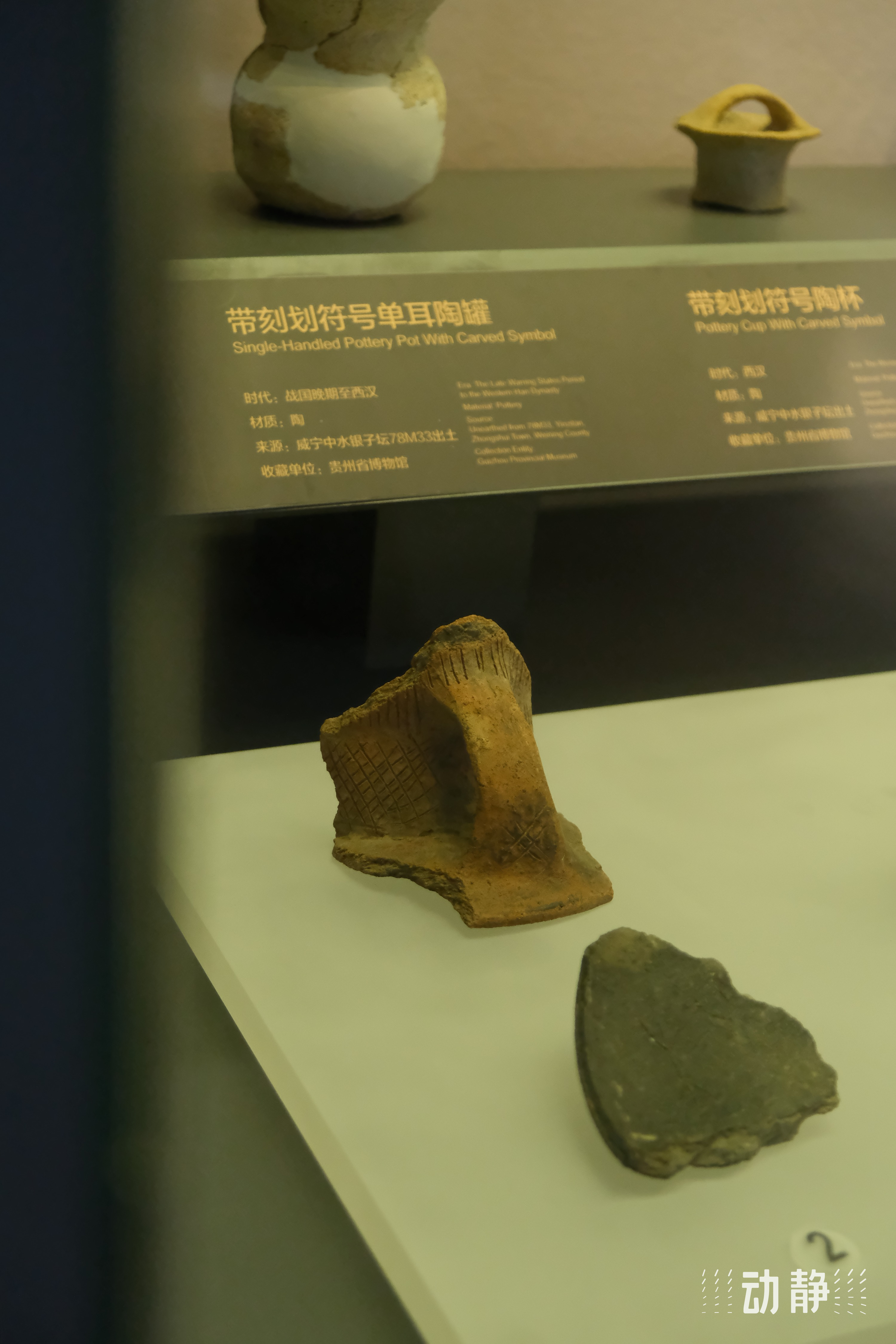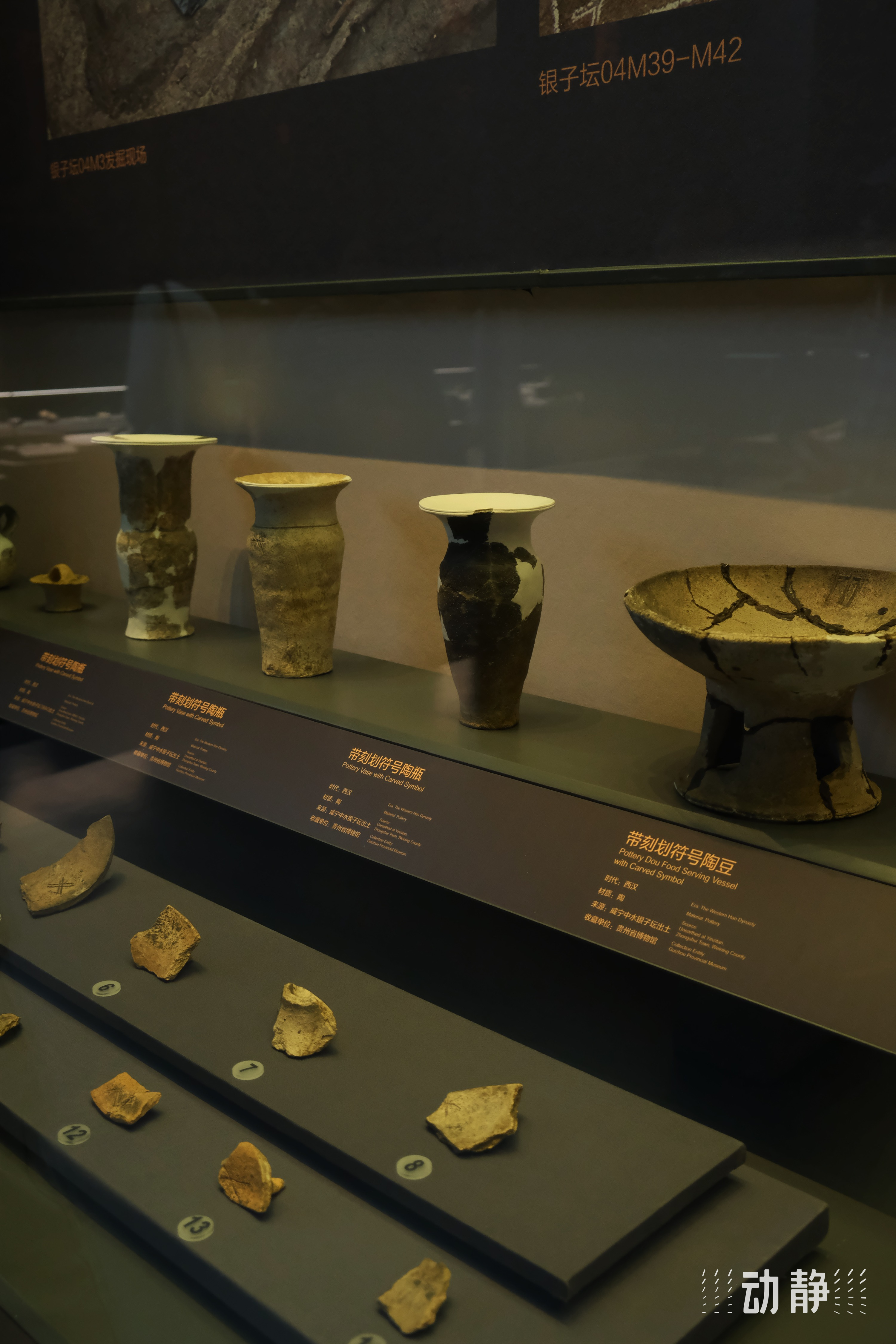 图为带有刻画符号的陶器以及陶器残件。起初这些符号并没有引起专家的注意,因为它们是非常常见的川字型、十字型这些普遍的符号。直到专家开始发现了一个陶豆罐,它有着一个矩形符号,形似门扉。而正是因为这一点,使得专家对于这些符号的意义产生了三种论调,第一种认为,这应该就是简单的装饰属性,用于记事记物;第二种认为,这可能是代表所有权和使用权;第三种则认为,这些符号代表了夜郎社会当中夜郎贵族的家族徽章。而正是因为有着这一点论调,也使得现在诸多学者对于夜郎社会构成和阶级规划产生了新的研究方向。