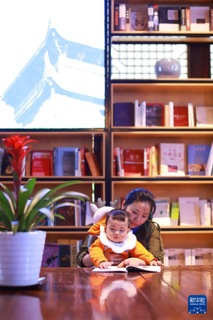 4月21日,在贵州省黔南布依族苗族自治州都匀市崇实书院,一名家长带着孩子阅读图书。新华社发(肖伟摄)