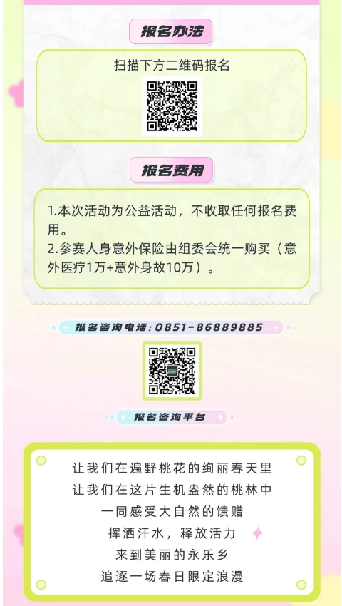 3月23日-24日,2024年第六届南明·永乐桃花跑活动将在南明区永乐乡桃花坞鸣枪开跑。2000名跑步爱好者将穿梭万亩桃林,近距离感受暖暖春日的魅力与生机。