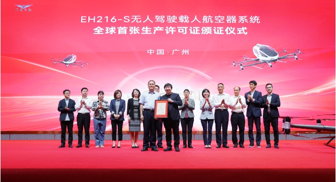 4月7日,EH216-S无人驾驶载人航空器系统生产许可证(Production Certificate, PC)颁证仪式在广州举行。广州市黄埔区区长、广州开发区管委会常务副主任冼银崧,广东省云浮市副市长王巍,中国民用航空中南地区管理局适航审定处处长林和勇,中国民用航空适航审定中心广州航空器审定分中心主任王敏等领导和嘉宾出席仪式。中国民航局(下文简称“中国民航局”)正式向亿航智能颁发EH216-S无人驾驶载人航空器系统生产许可证(Production Certificate, PC),这也是全球eVTOL行业内首张生产许可证,是自EH216-S成功取得型号合格证(Type Certificate, TC)、标准适航证(Standard Airworthiness Certificate, AC)之后的又一重要里程碑,标志着EH216-S率先迈入规模化生产阶段,也为下一步的商业化运营提供重要保障。