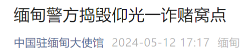 5月10日,根据群众举报和中国驻缅甸大使馆协调,缅甸警方采取突击行动,捣毁仰光省玛仰贡镇区一酒店内盘踞的电信诈骗和赌博团伙,抓获包括16名中国籍人员在内的47名犯罪嫌疑人,现场缴获大批涉诈赌工具。