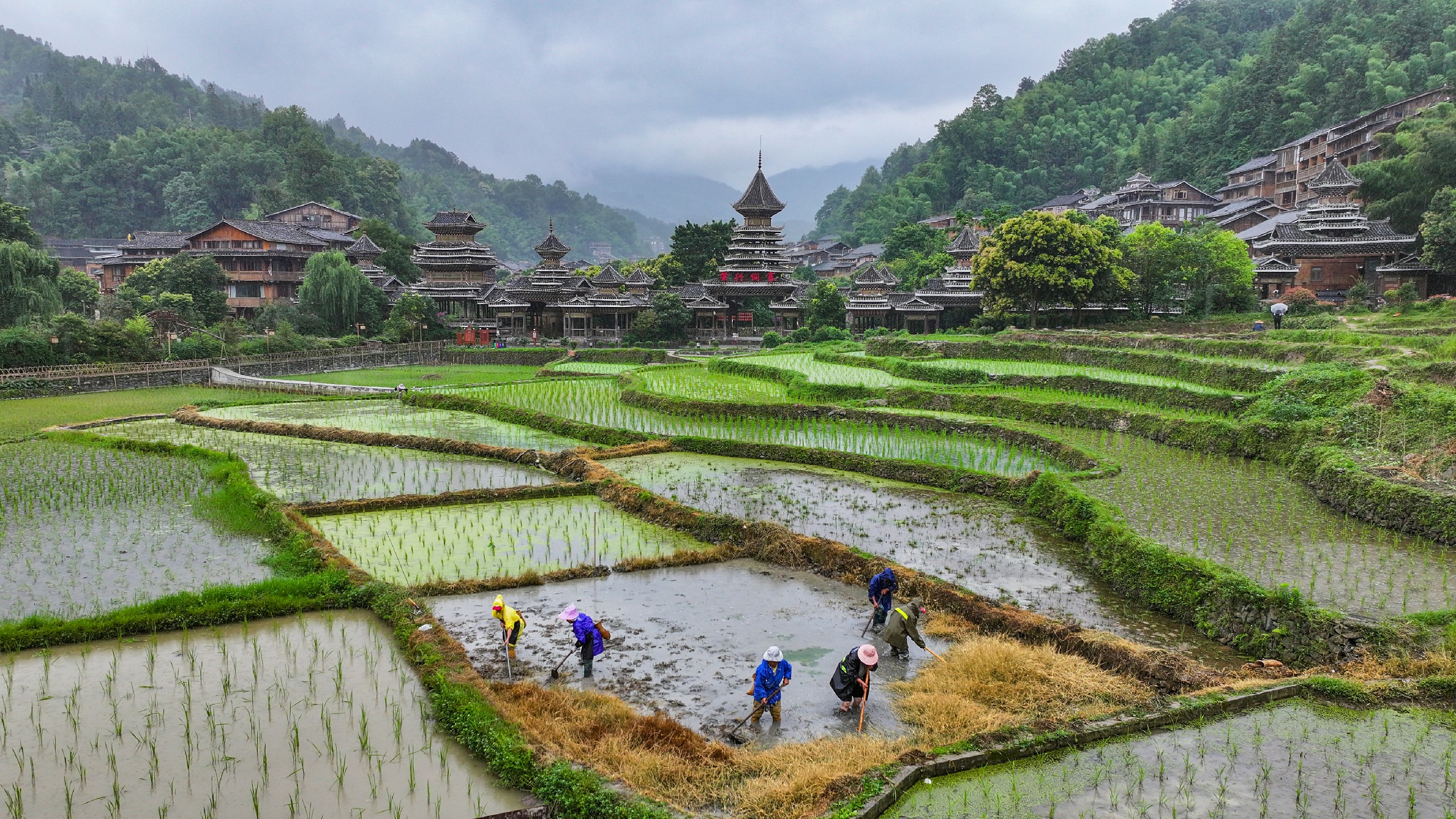 在肇兴侗寨寨门外,农民们身着雨衣,散布田间,他们在田里忙碌除草,准备着下步插秧。一位老农头戴斗笠,手握犁耙,黄牛在雨中忙碌犁田,农民紧跟其后,步伐坚定而有力。雨水顺衣滑落,汗水融入雨水,辛勤的身影在湿润的土地上勾勒出生命的轨迹,共同化为对大地的热爱与期待。