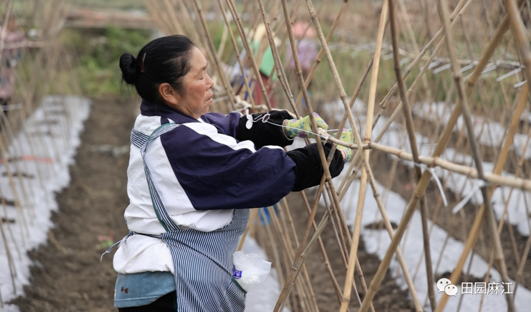 “这块田是我家的,我租出去给老板了,跟老板做活路,还能挣到点收入。”水城村村民李发芬一边搭着豆架一边开心说道。