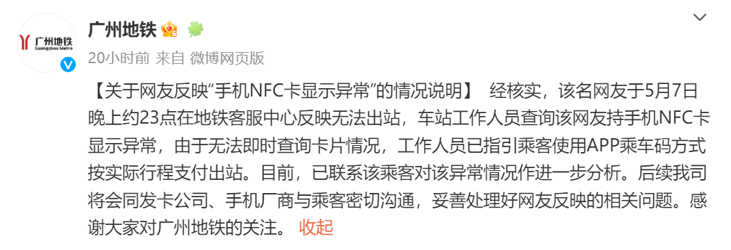 5月9日,广州地铁发布《关于网友反映“手机NFC卡显示异常”的情况说明》,经核实,该名网友于5月7日晚上约23点在地铁客服中心反映无法出站,车站工作人员查询该网友持手机NFC卡显示异常,由于无法即时查询卡片情况,工作人员已指引乘客使用APP乘车码方式按实际行程支付出站。目前,已联系该乘客对该异常情况作进一步分析。后续广州地铁将会同发卡公司、手机厂商与乘客密切沟通,妥善处理好网友反映的相关问题。