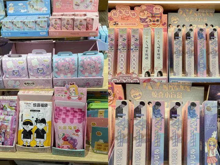在贵阳、沈阳等地,部分中小学周边的文具店里,“中性笔盲盒”“橡皮盲盒”“文具盲袋”等盲盒类学具仍被商家摆在显著位置销售。