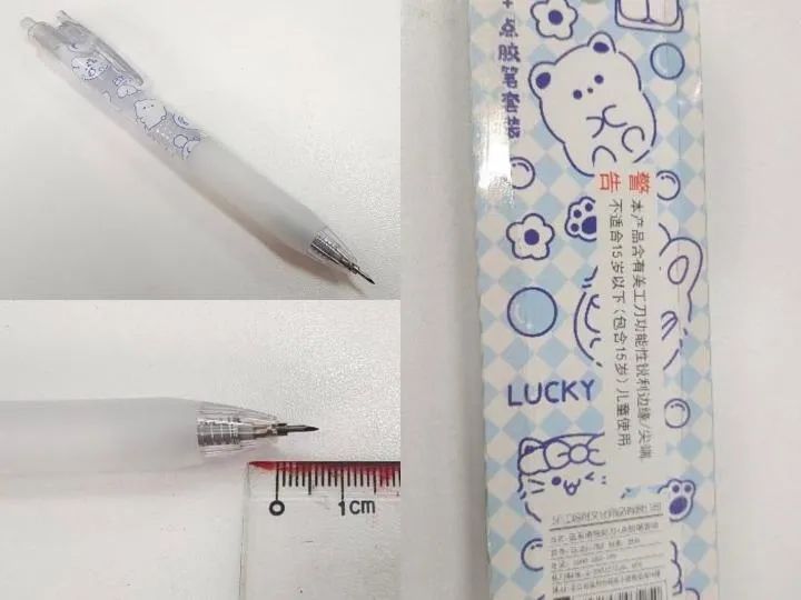 经测量,这款刻刀笔弹出的刻刀部分达0.5厘米,非常锋利。记者注意到,在其包装背面标注有明确的“警告”:本产品含有美工刀功能性锐利边缘/尖端。不适合15岁以下(包含15岁)儿童使用。但出售该品的几家文具店均开在当地小学周边,店主也未设置购买年龄限制。江苏、广东、贵州的其他一些地方也有类似情况。