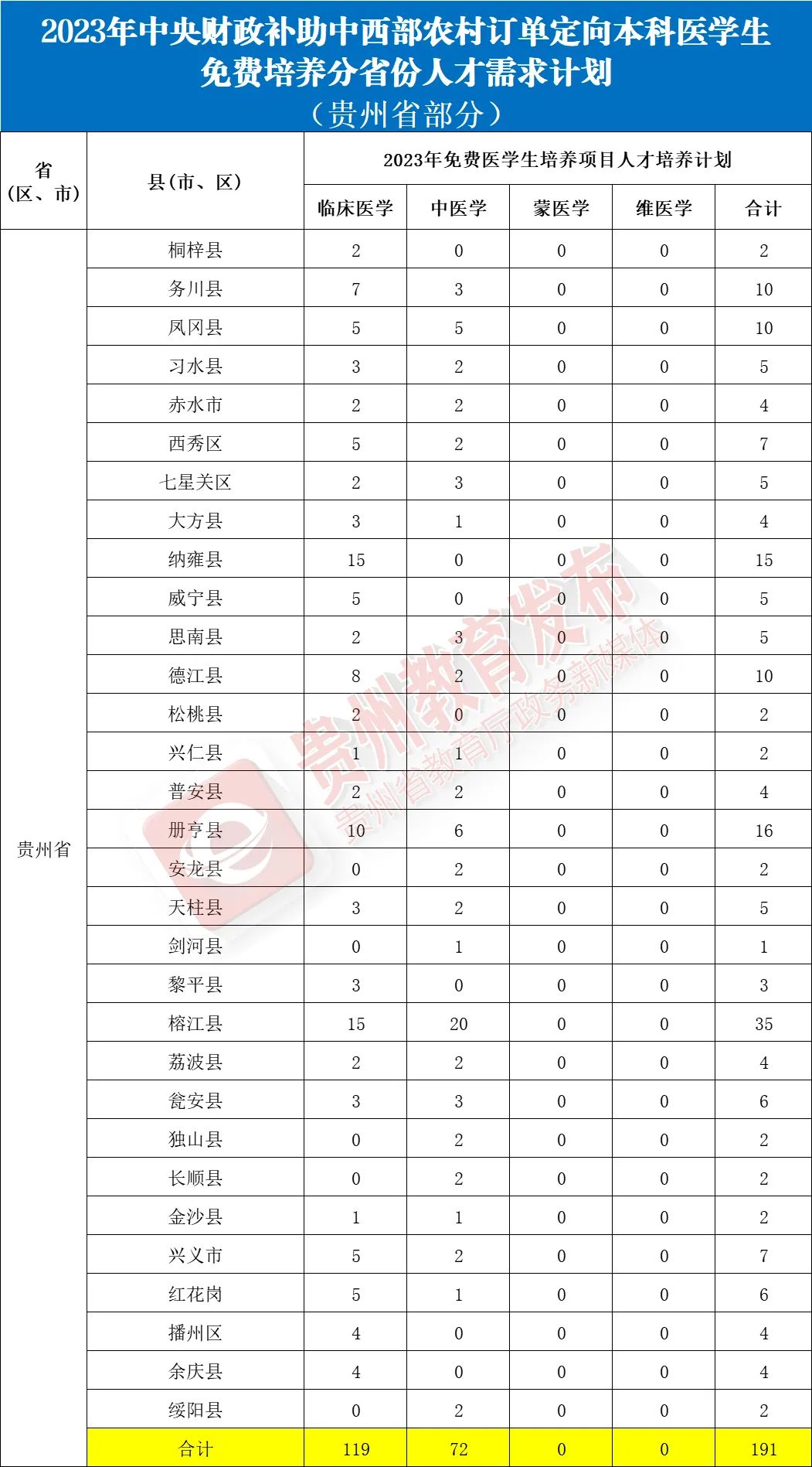 近日,教育部发布《关于做好2023年中央财政支持中西部农村订单定向免费本科医学生招生培养工作的通知》,今年将继续为中西部乡镇卫生院培养订单定向免费五年制本科医学生共计6150人,其中,贵州191人。一起来看↓↓↓