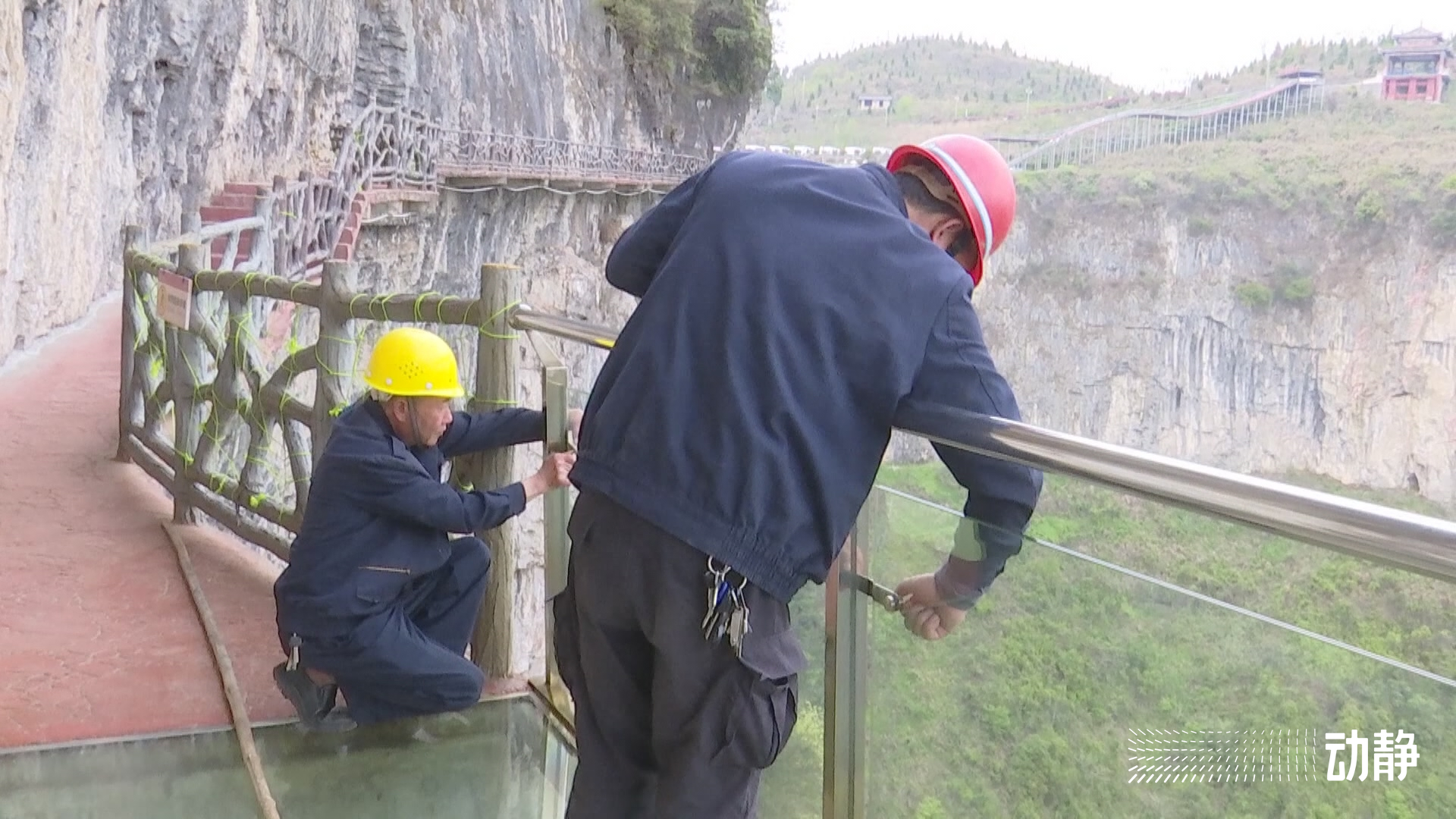 在铜仁市朱砂古镇景区,工作人员对各旅游设施的安全网是否牢固、螺丝钉是否有松动、滑道上是否有凸起板块、栈道内落石情况等进行逐一检查,发现问题进行逐一登记、整改。
