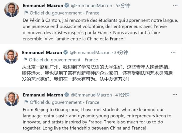 ▲法国总统马克龙在社交媒体上,用中文、英语和法语分享了自己的访华感受,并表示“法中友谊万岁!”
