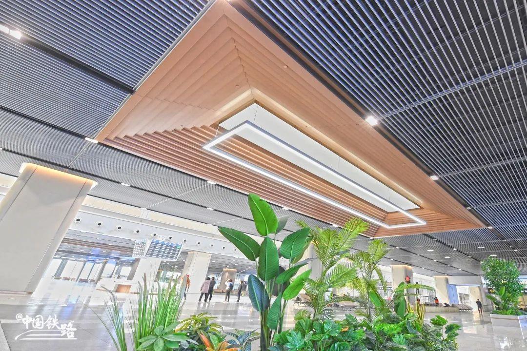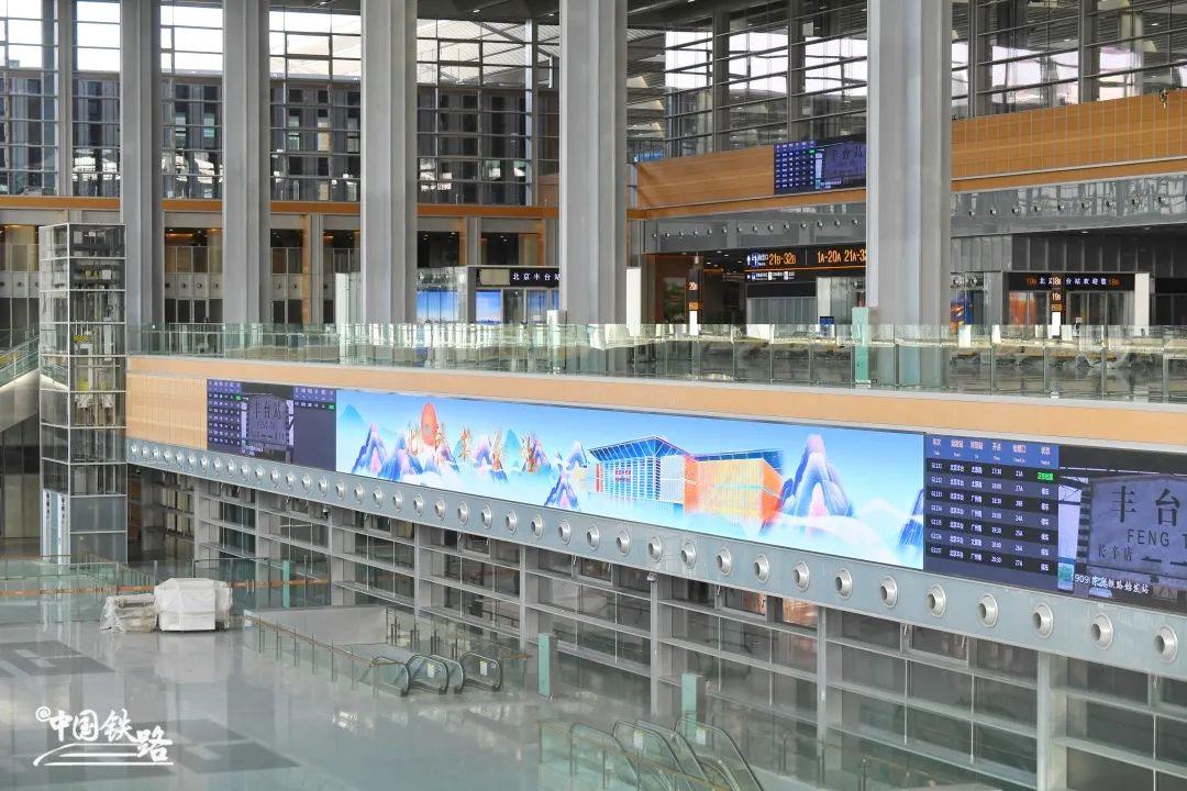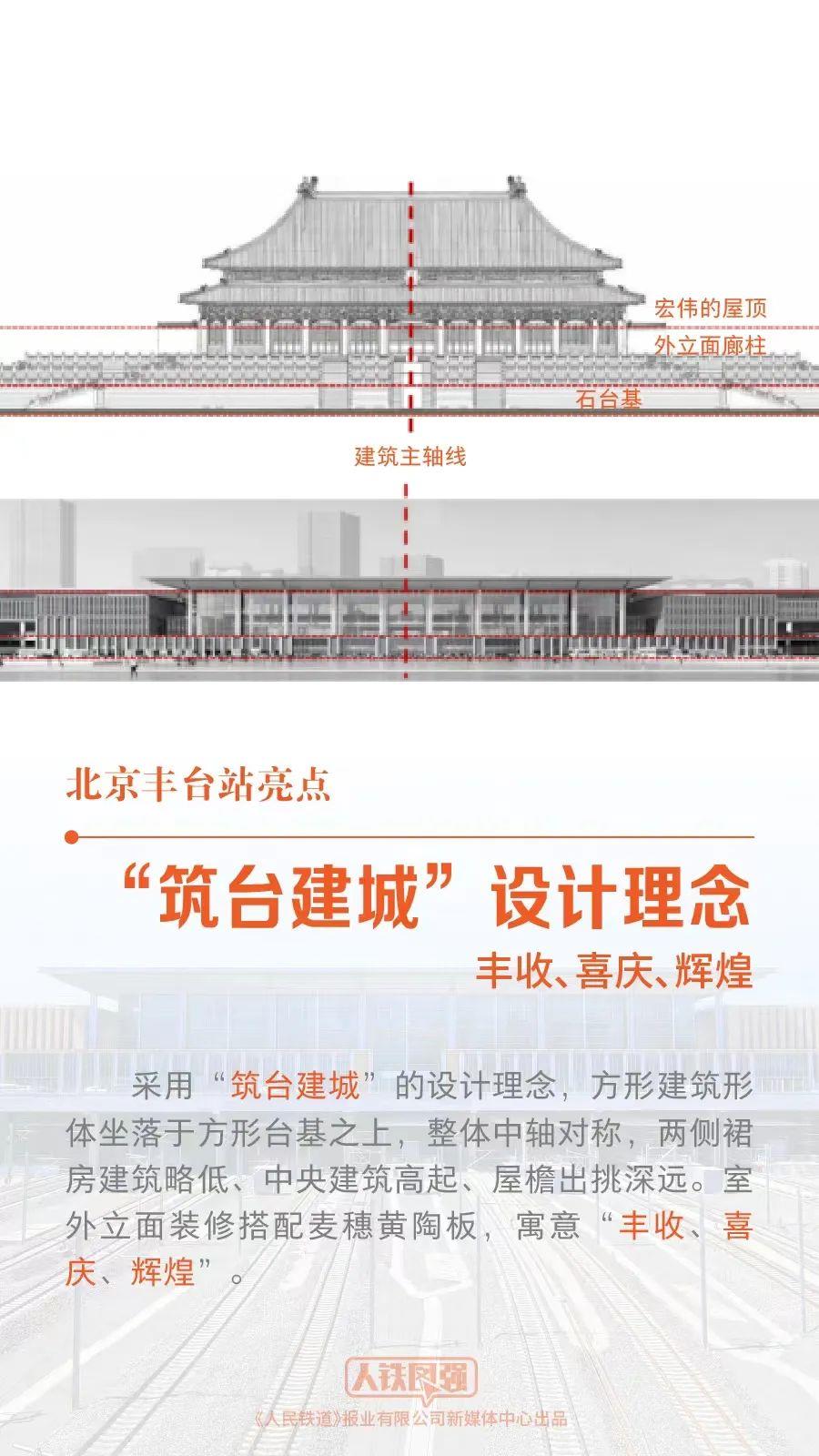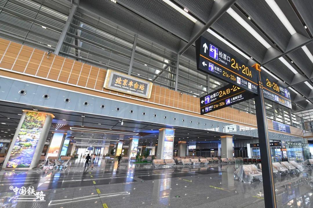 从高空俯瞰,车站整体呈独特的“中”字造型;站内装饰采用麦穗黄陶板,寓意“丰收、喜庆、辉煌”;室内装修具有鲜明的现代工业风;候车区域的藻井吊顶、钟鼓楼造型,让旅客候车时能够感受浓浓的北京文化元素……