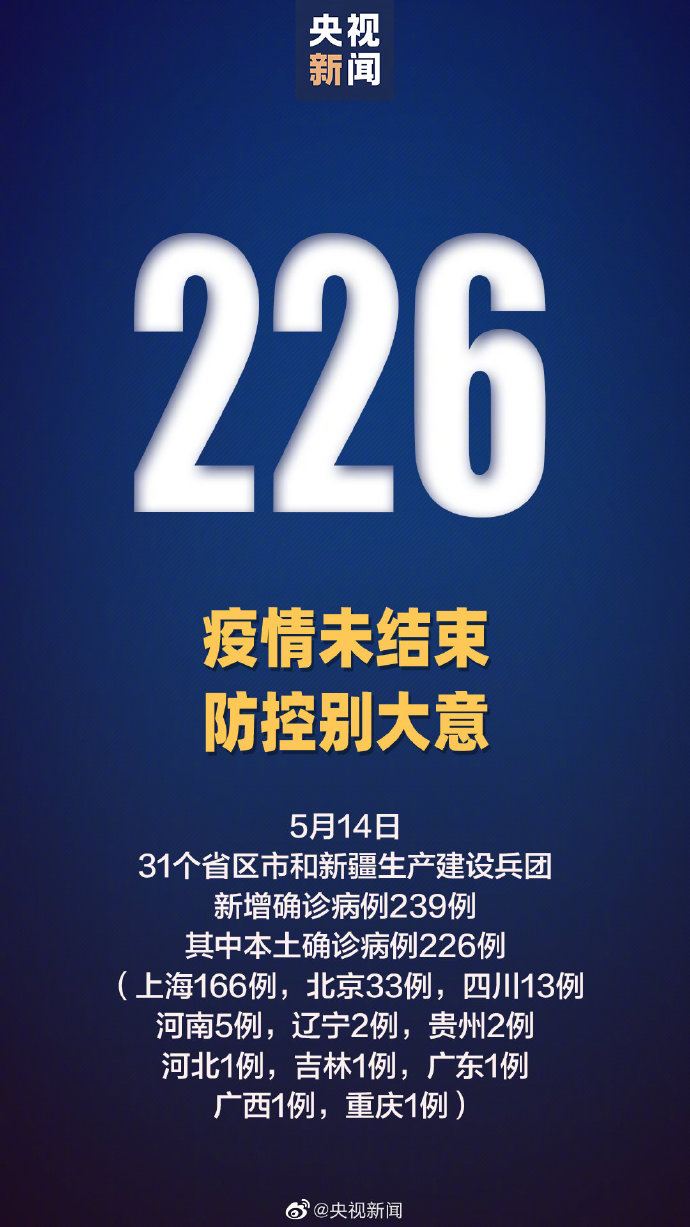 5月14日0—24时,31个省(自治区、直辖市)和新疆生产建设兵团报告新增确诊病例239例。其中境外输入病例13例(福建7例,上海2例,云南2例,广东1例,四川1例),含1例由无症状感染者转为确诊病例(在广东);本土病例226例(上海166例,北京33例,四川13例,河南5例,辽宁2例,贵州2例,河北1例,吉林1例,广东1例,广西1例,重庆1例),含120例由无症状感染者转为确诊病例(上海111例,北京7例,四川2例)。新增死亡病例3例,均为本土病例,均在上海;无新增疑似病例。