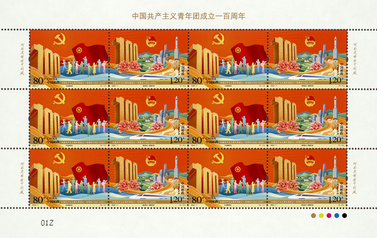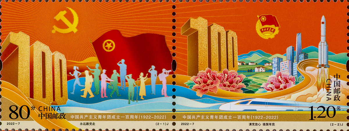中国邮政定于2022年5月5日发行《中国共产主义青年团成立一百周年》纪念邮票一套2枚。邮票图案名称分别为:永远跟党走、请党放心 强国有我。全套邮票面值为2元。邮票计划发行数量为730万套。