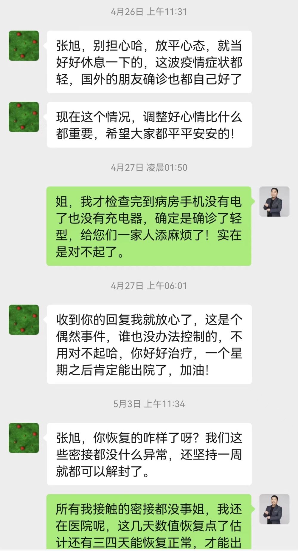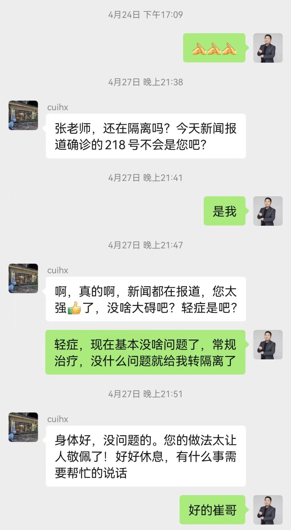“感觉挺自豪的,心情很振奋。”住院期间,看到自己的抗疫事迹得到了大家的称赞,给社会带来了正能量,张先生很欣慰,“最重要的是这条传播链到我这就结束了,没有继续扩散。”5月10日康复出院时,原本可以居家隔离观察的张先生仍然主动提出去隔离酒店,“这样就不会影响同住的室友了。”