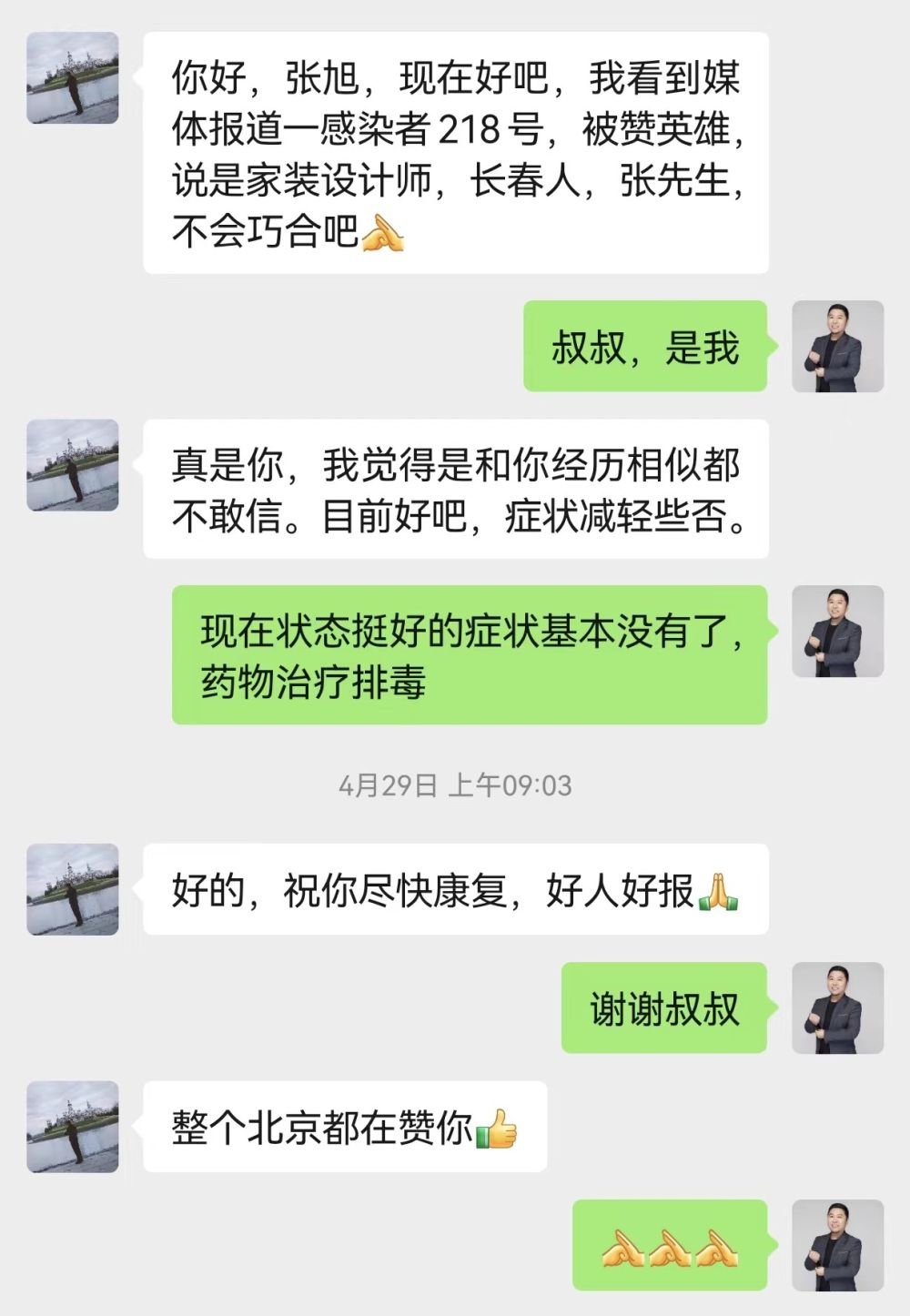 张先生治疗的过程比较顺利,只有4月25日当天出现高烧、肌肉酸痛,但仅仅一天就退烧,之后的症状就很轻微。医院的一名男护士还特意跑到张先生身边,问他是不是“218号”感染者,在医院休息得如何,帮他排忧解难。