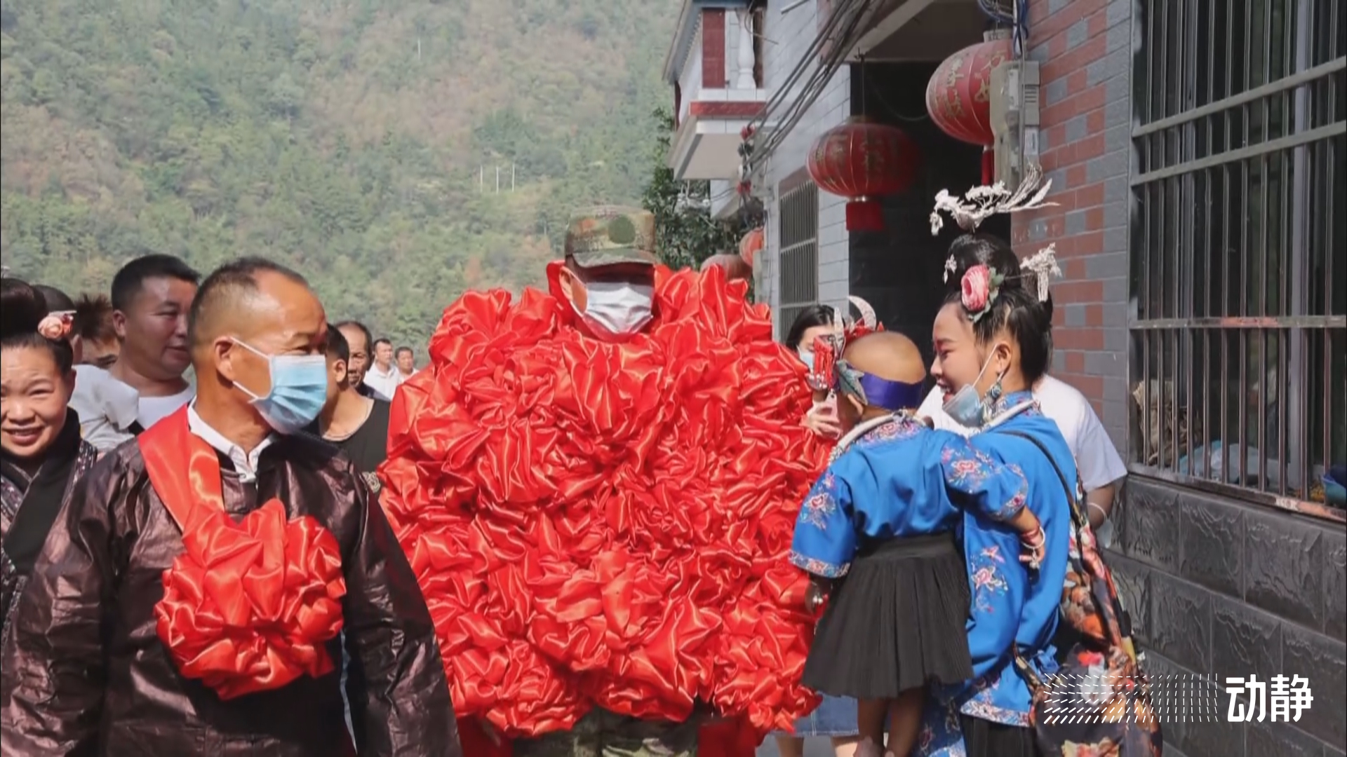24岁的刘国保今年刚大学毕业,是今年秋季村里唯一一个应征入伍的新兵。出发当天一大早,乡亲们就拿着扎好的红花来到他家,给他戴在身上。来送行的人越来越多,刘国保身上的红花也越来越多,30多朵红花把刘国保打包成了“花球”,乡亲们的热情和祝福将他团团包围。